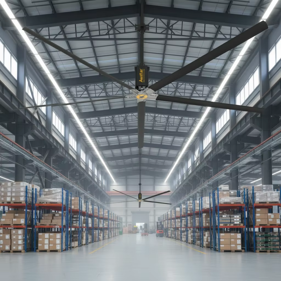 พัดลมเพดานอุตสาหกรรม AUSTAR HVLS รับประกัน 3 ปี ควบคุมผ่านแอป Android เทคโนโลยีอากาศพลศาสตร์ขั้นสูง สำหรับคลังสินค้า โรงงาน ประหยัดพลังงาน