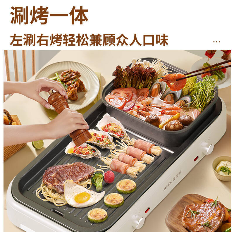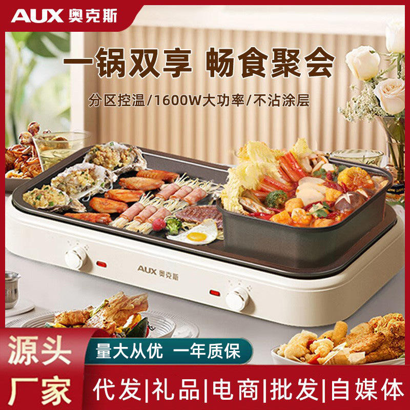 หม้อไฟฟ้าอเนกประสงค์ AUX 1501W-2000W แบบไม่ติดกระทะ ใช้งานได้สองแบบ สำหรับใช้ในบ้าน หม้อไฟและบาร์บีคิวในเครื่องเดียว