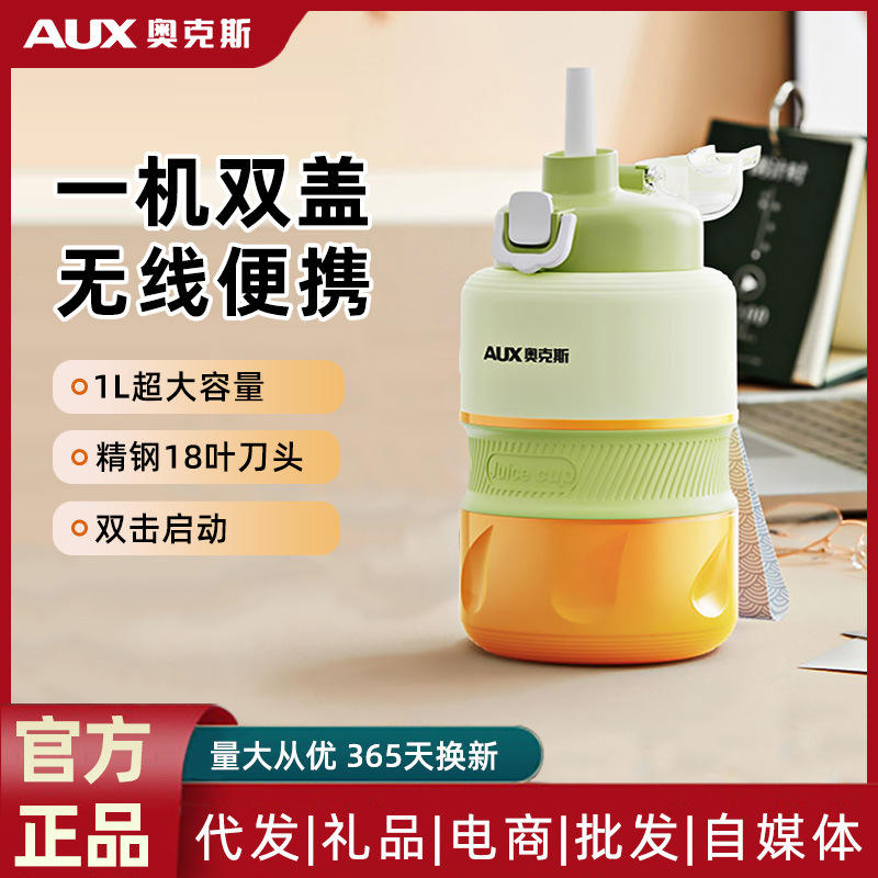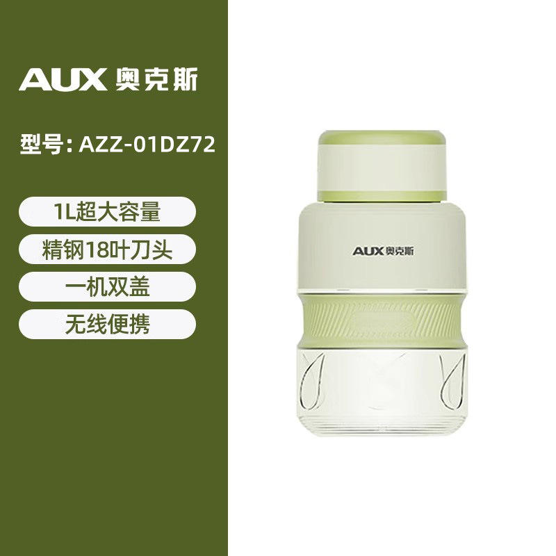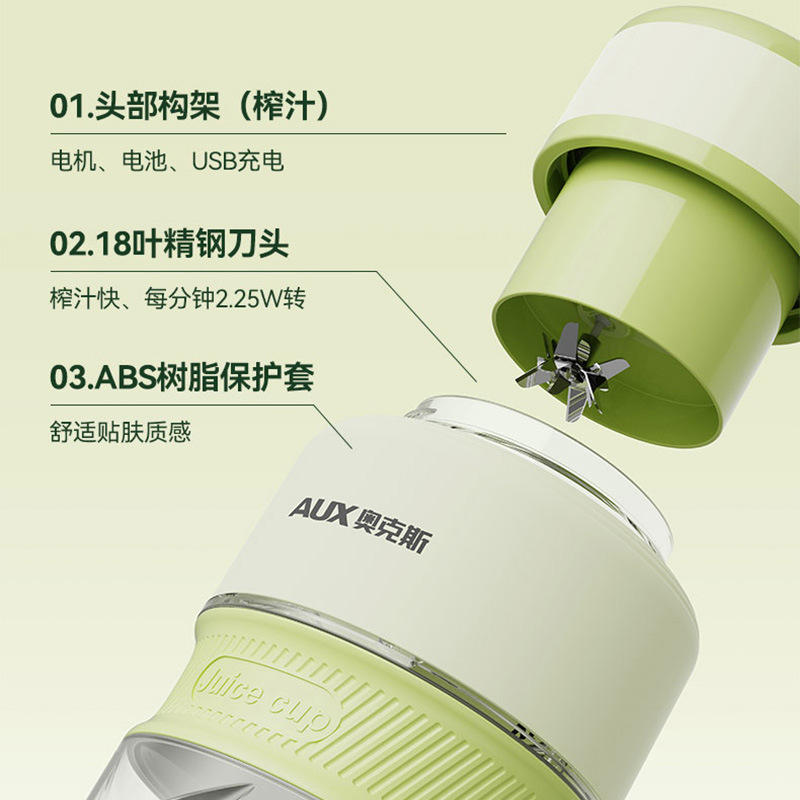 เครื่องคั้นน้ำผลไม้แบบพกพา AUX ความจุ 1 ลิตร ใช้พลังงานจากแบตเตอรี่ ชาร์จผ่าน USB ใช้งานง่าย ตัวเครื่องทำจากพลาสติกสีเขียว
