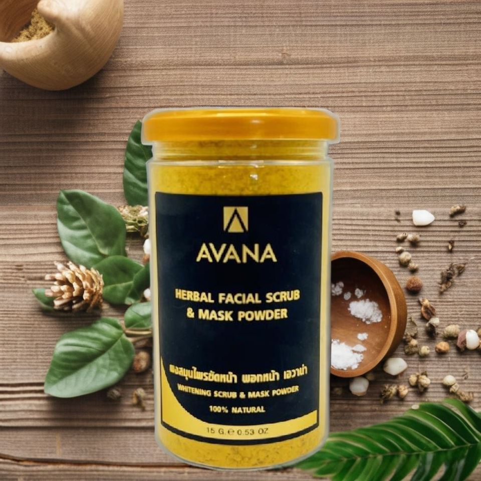 ผงมาส์กขัดผิวสมุนไพร AVANA สำหรับผิวแพ้ง่าย ผิวมัน ผิวผสม ส่วนผสมหลัก ขมิ้น สำหรับผิวหน้า ผิวกาย คอ วัสดุผลึก