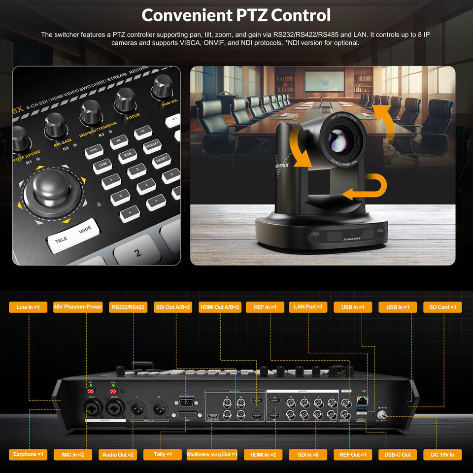 ตัวสลับวิดีโอ8ช่อง SDI 4K HDMI S8X ฉลาม avmatrix พร้อมหลายมุมมองการสตรีมสดการบันทึกและการควบคุม PTZ แบบมืออาชีพ