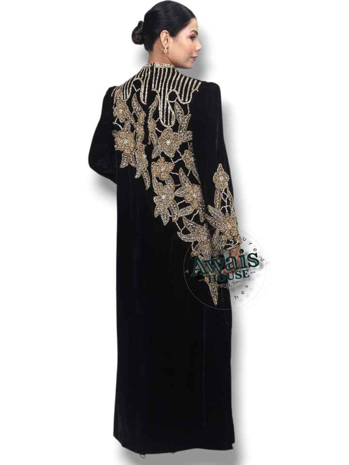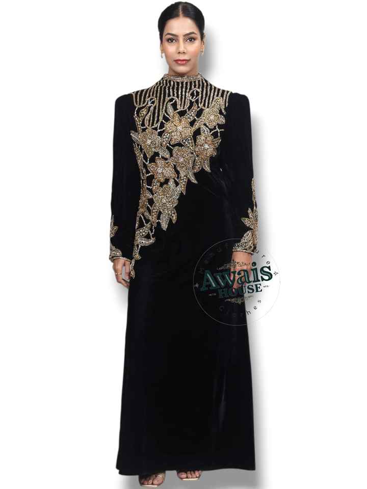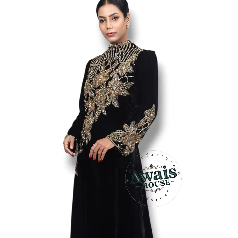 AWAIS HOUSE ชุดเดรสผ้ากำมะหยี่นำเข้าแบบซักได้ ประดับคริสตัลและลูกปัด แขนยาว ความยาวถึงพื้น เรียบง่าย ทรงเอไลน์