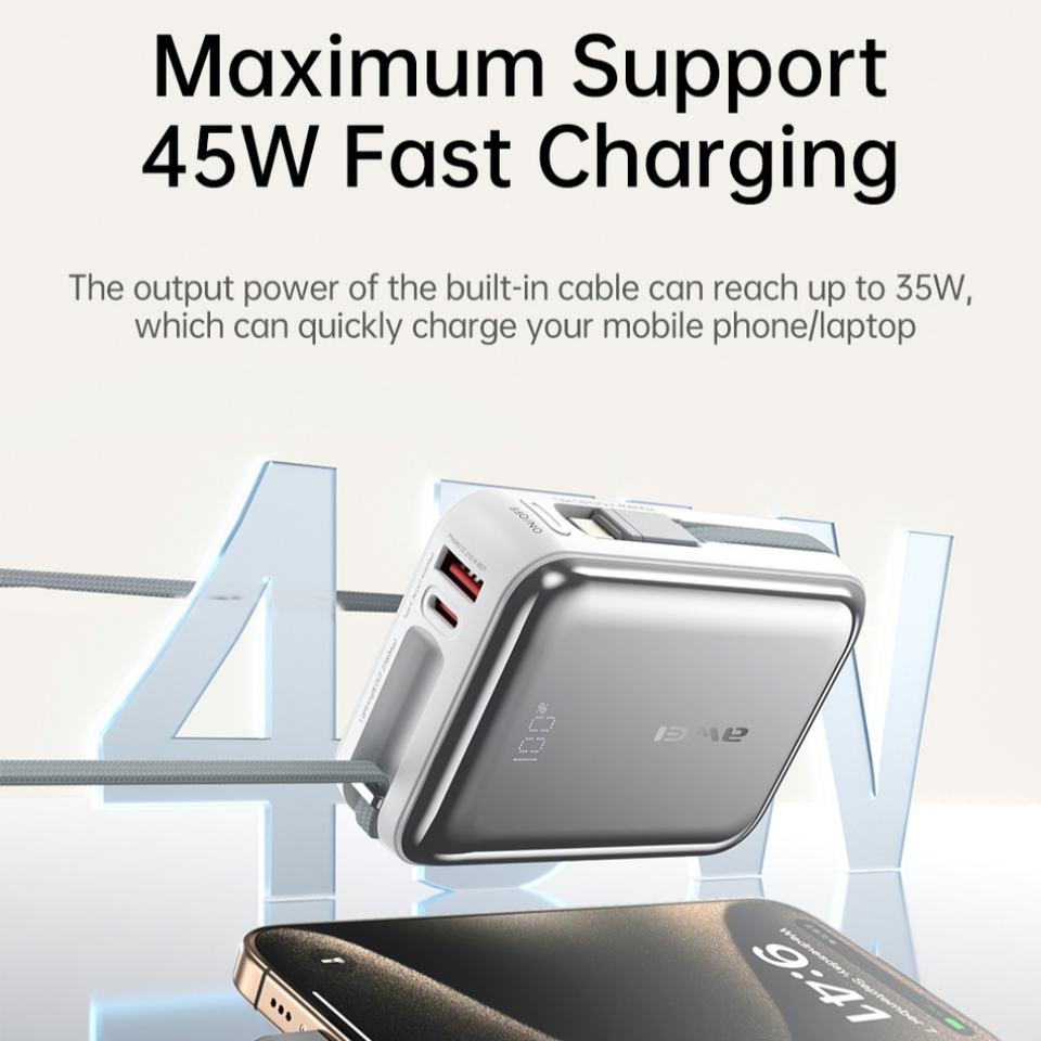 AWEI พาวเวอร์แบงค์ความจุสูง 20000mAh ชาร์จเร็วสองทาง พร้อมระบบชาร์จเร็ว 45W PD