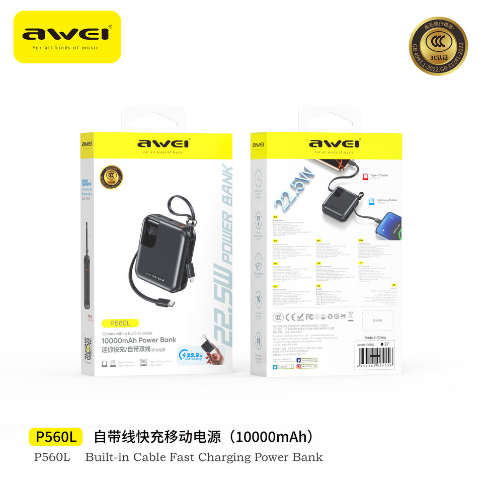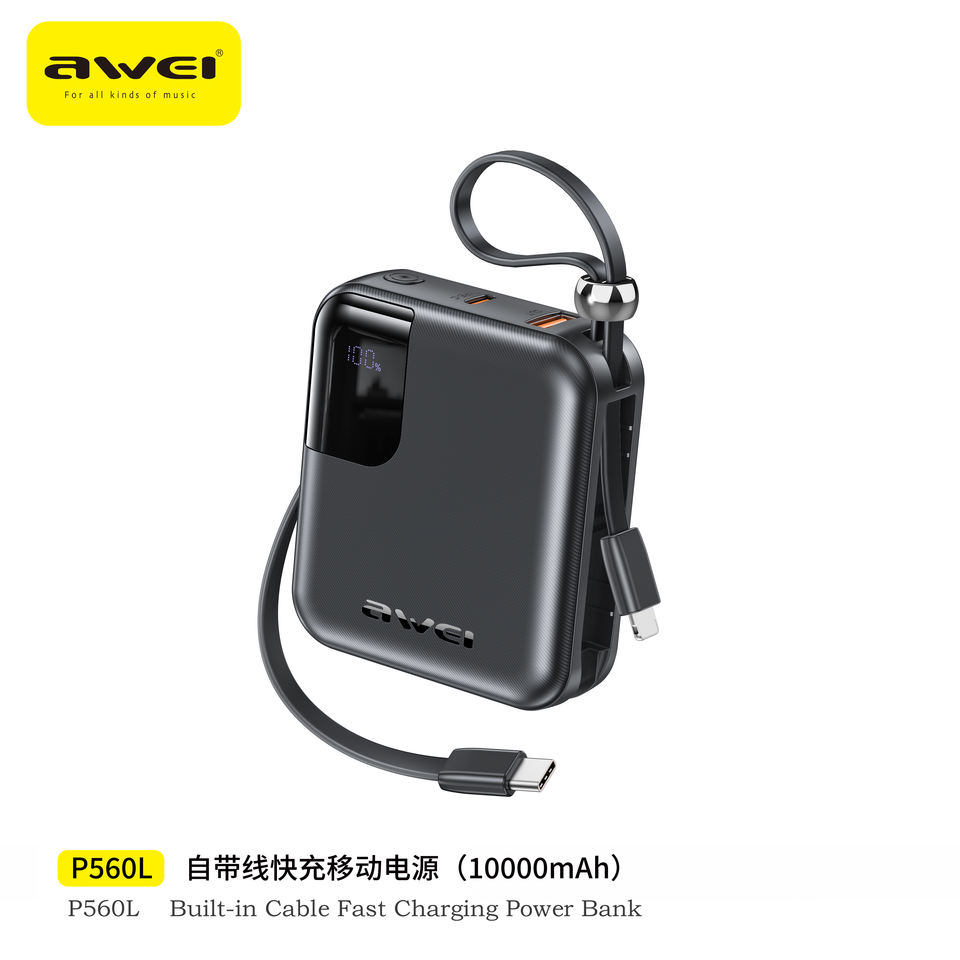 AWEI พาวเวอร์แบงค์ขนาดเล็กคุณภาพสูง วัสดุ PVC ความจุ 10000mAh รองรับการปรับแต่งโลโก้ แบตเตอรี่ Li-Polymer พร้อมหน้าจอ LED และสายชาร์จในตัว