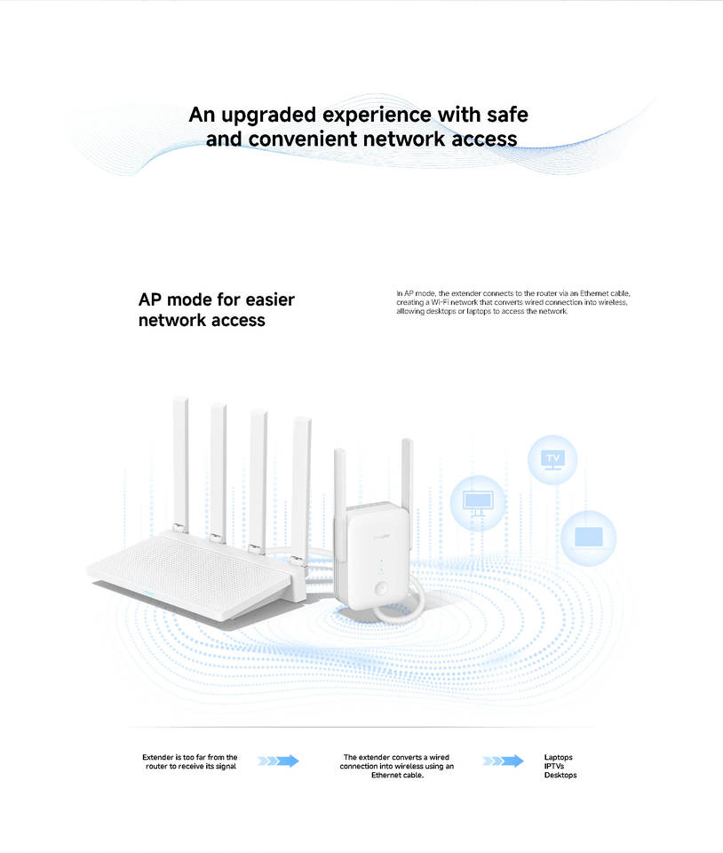 Working Mode:Range Extender mode, Mesh mode, Access Point (AP) mode