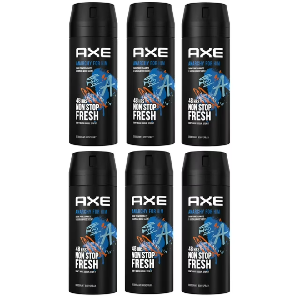 AXE Anarchy 150มล./5.07ออนซ์ 0% แอลกอฮอล์ สเปรย์ระงับกลิ่นกายสำหรับทุกเพศ กลิ่นน้ำหอม Eau De Toilette ส่วนผสมเคมีภัณฑ์ แพ็ค 6 ชิ้น สำหรับผู้ใหญ่