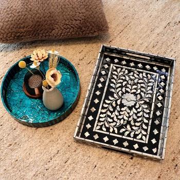 ถาดไม้ฝังกระดูกทำมือ Aaliyan Impex งานฝีมือเรซิ่นและไม้ทรงกลม ขนาดสั่งทำได้ ขายดีที่สุด เหมาะสำหรับตกแต่งบ้านหรือใช้ใส่อาหาร