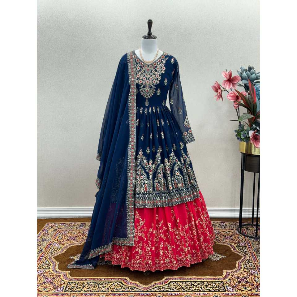 ชุดเลเฮนกาและผ้าคลุมไหล่สีกรมท่า ผ้าจอร์เจตต์เทียมเนื้อหนา ดีไซน์สวยงามจาก Aarohi สำหรับงานปาร์ตี้ ไซส์ผู้หญิง M น้ำหนัก 900 กรัม