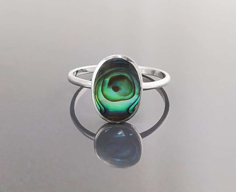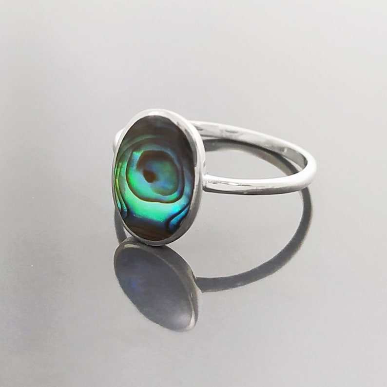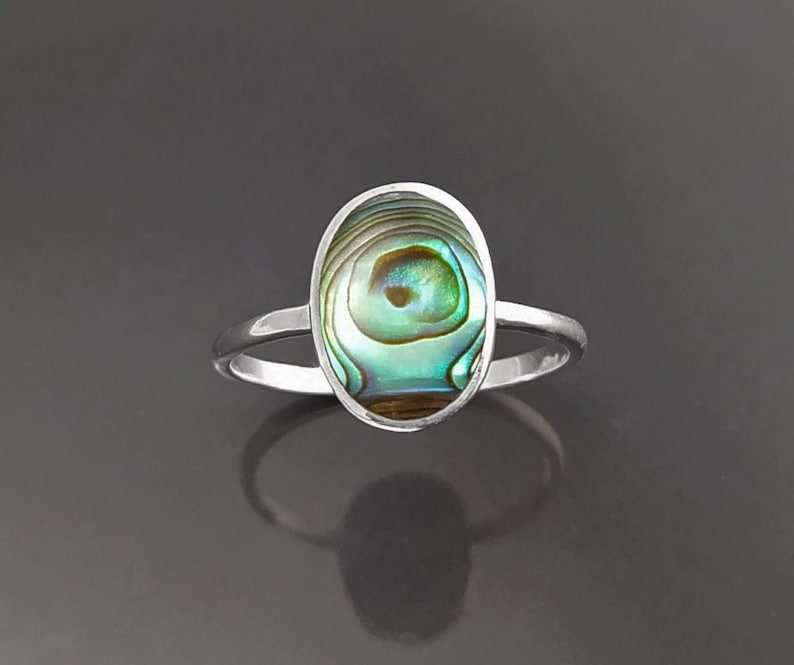 แหวนรูปไข่แบนประดับเปลือกหอยเป๋าฮื้อแท้ สีรุ้งสะท้อนแสง ดีไซน์เรียบง่าย ทำจากเงินแท้