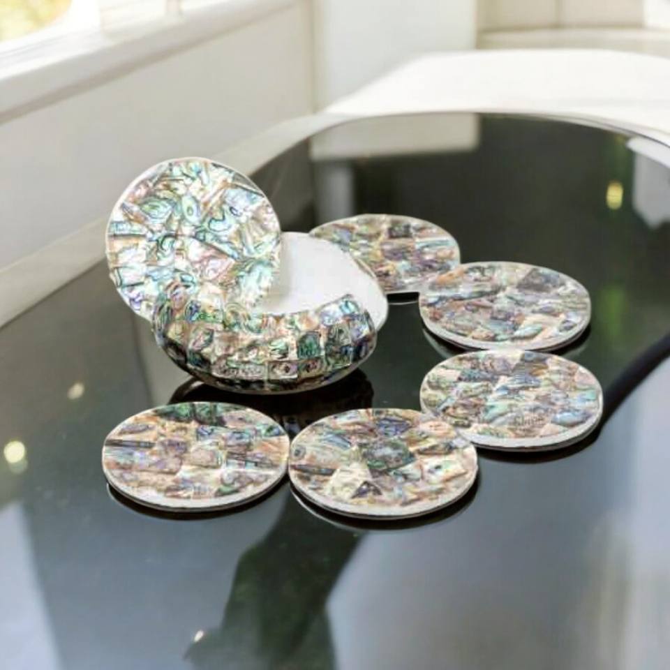 ถาดรองแก้วหินฝังเปลือกหอยเป๋าฮื้อทรงกลมสินค้างานฝีมือโบราณแบบทันสมัยสำหรับสีธรรมชาติ
