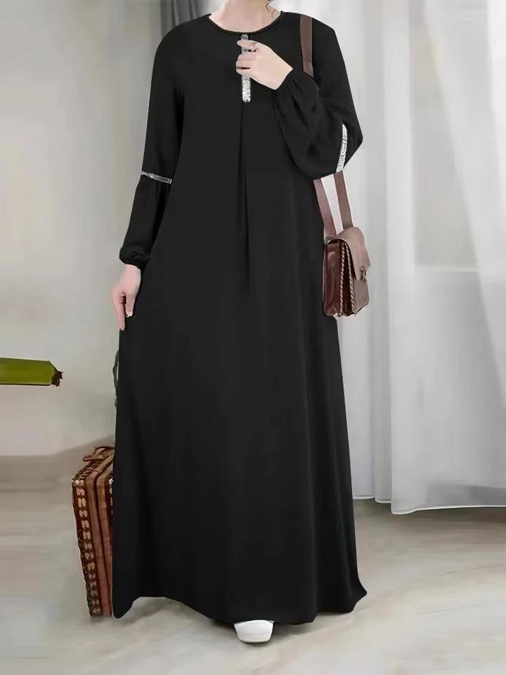 เดรสมุสลิมสำหรับผู้หญิงเดรสอาบายาแบบปิดสีทึบพร้อมเข็มขัดผูกผ้าโพลีเอสเตอร์2025สไตล์ดูไบ