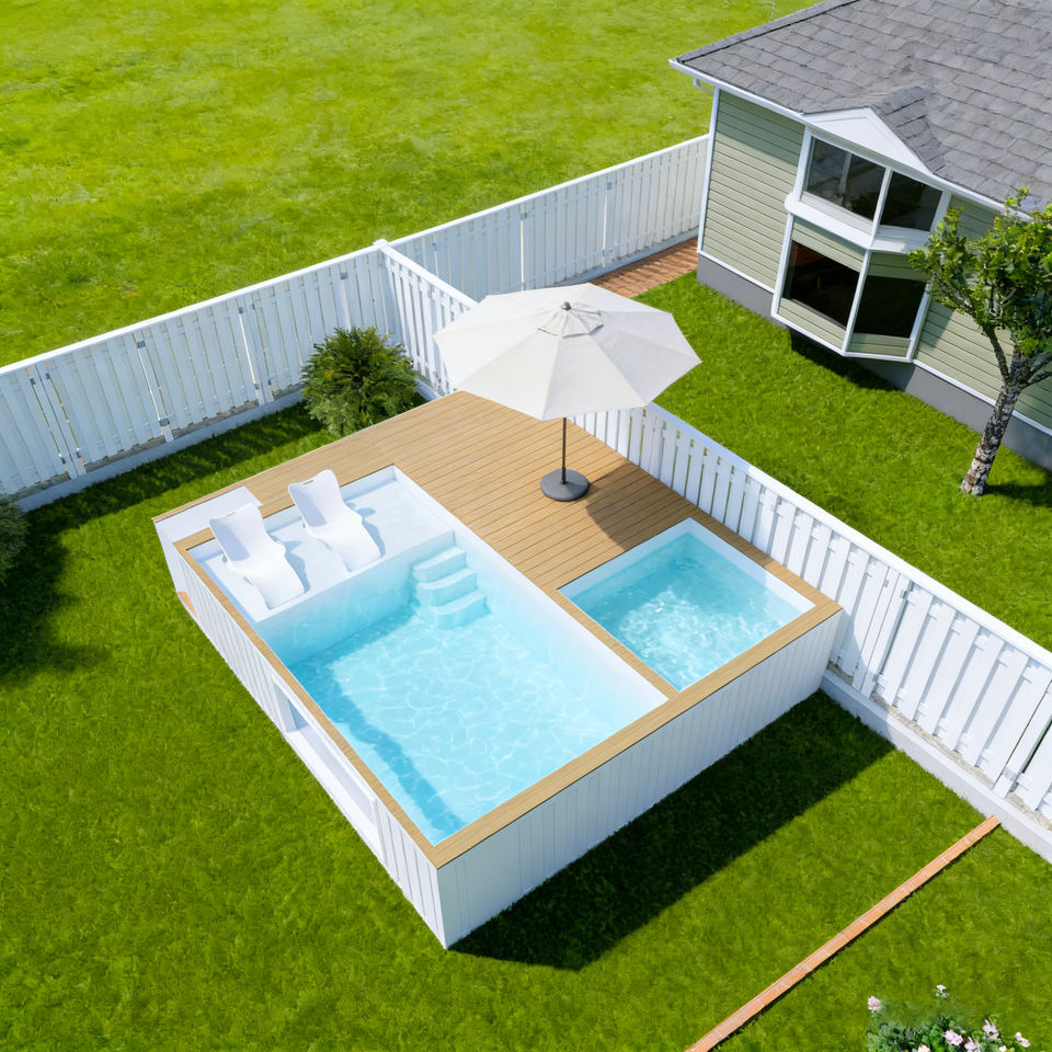 สระว่ายน้ำไฟเบอร์กลาสพร้อมพื้นไม้ ติดตั้งอ่างจากุซซี่ในตัว สีตามสั่ง รับประกัน 30 ปี สำหรับครอบครัวและเด็ก ป้องกันรังสียูวี