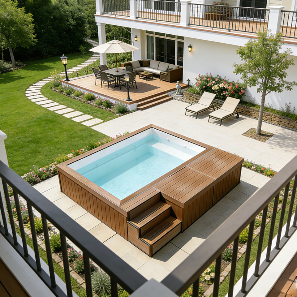 สระว่ายน้ำไฟเบอร์กลาสแบบตั้งพื้นพร้อมที่นั่งโซฟาสำหรับครอบครัวในสวนหลังบ้าน ประกอบง่าย