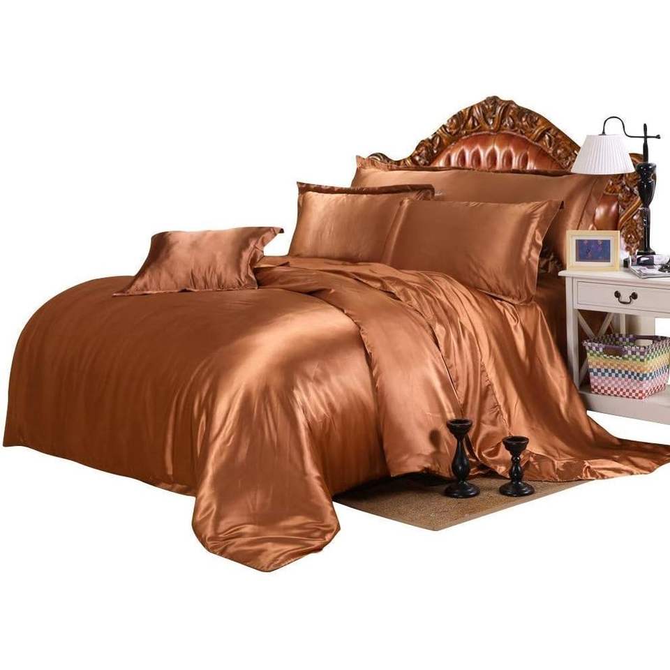 Abp Collection Satin Bed Sheet Set Queen Size 4 Piece Solid Brown Deep Pocket Wrinkle Resistant Home Use
