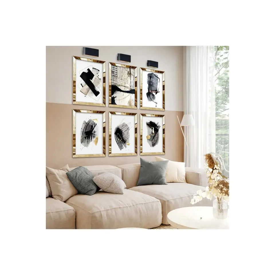 ชุดภาพวาดแอบสแตรกต์ MDF ไร้ขอบทำจากแก้ว6ชิ้นลายธีมสีดำ