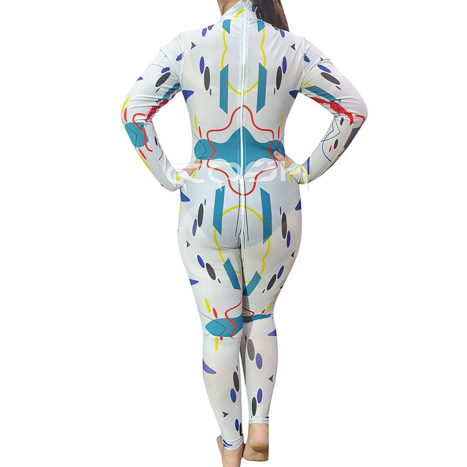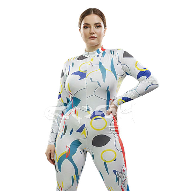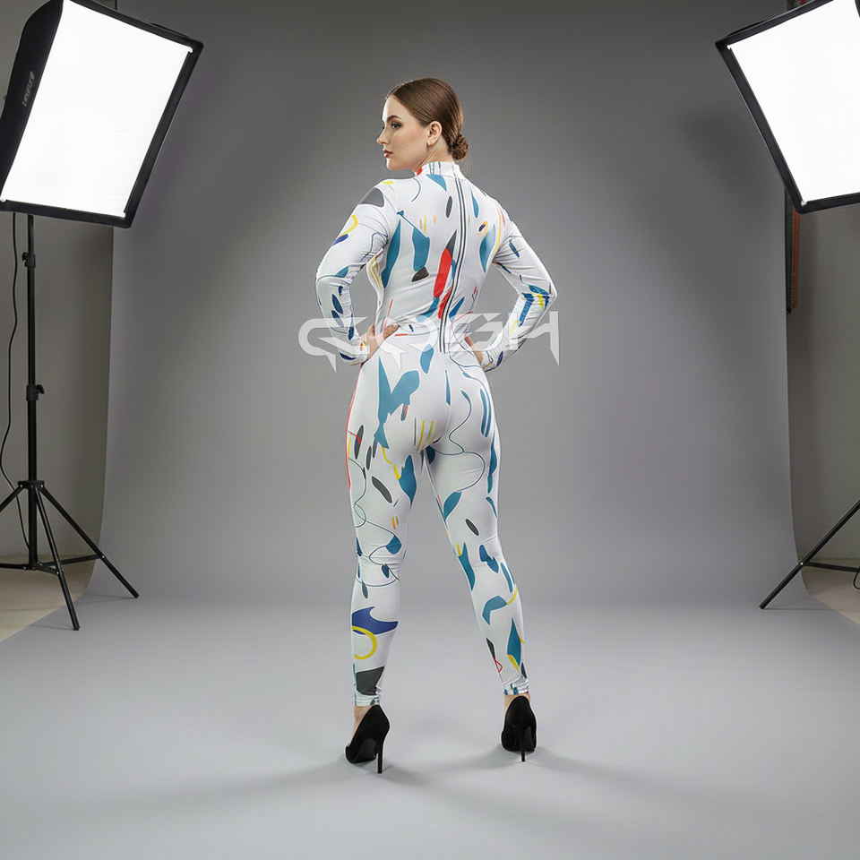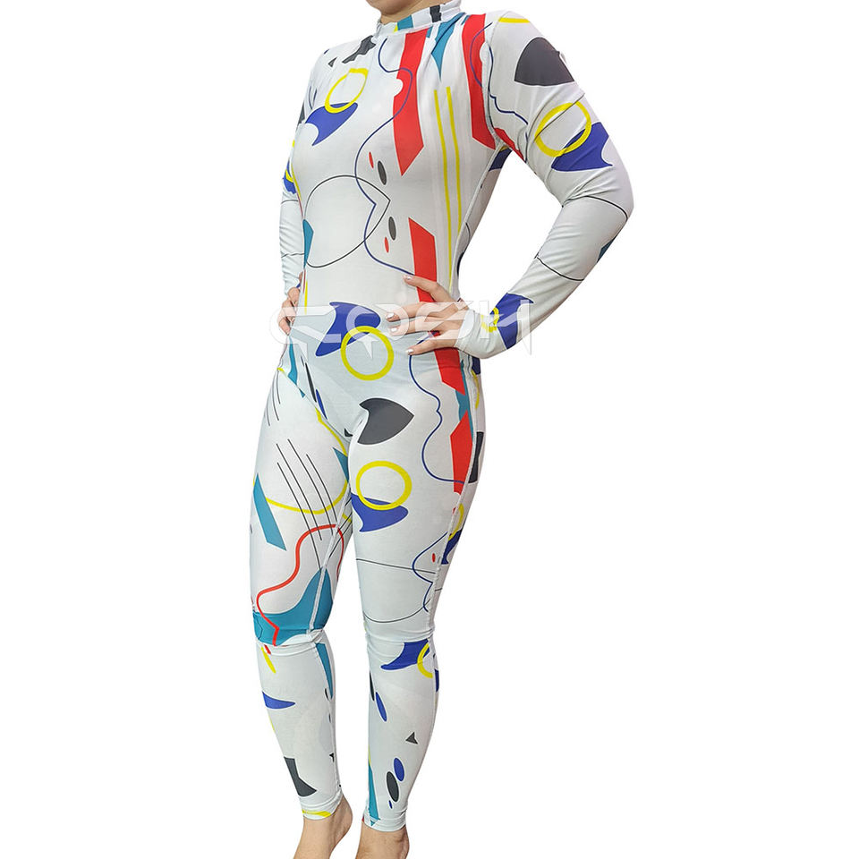 ชุดโยคะแบบชิ้นเดียวพิมพ์ลายเรขาคณิตแบบนามธรรม แขนยาว คอเต่า ชุดรอมเปอร์ฟิตเนสพิมพ์ลายทั้งตัว ชุดจั๊มสูทยืดหยุ่นได้