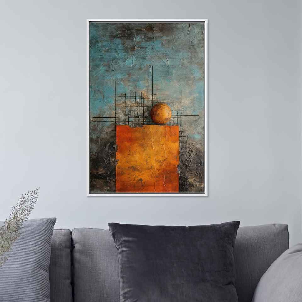 ศิลปะติดผนังรูปทรงเรขาคณิตแบบนามธรรม: ภาพพิมพ์สีส้มทองสดใสบนผ้าใบ พร้อมกรอบสีขาว