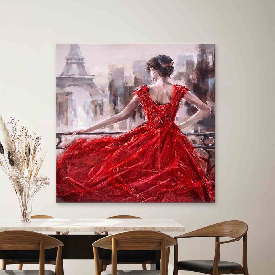 ภาพพิมพ์บนผ้าใบศิลปะนามธรรมของผู้หญิง: ของตกแต่งผนังสีแดงสมัยใหม่ ห่อหุ้มอย่างดี