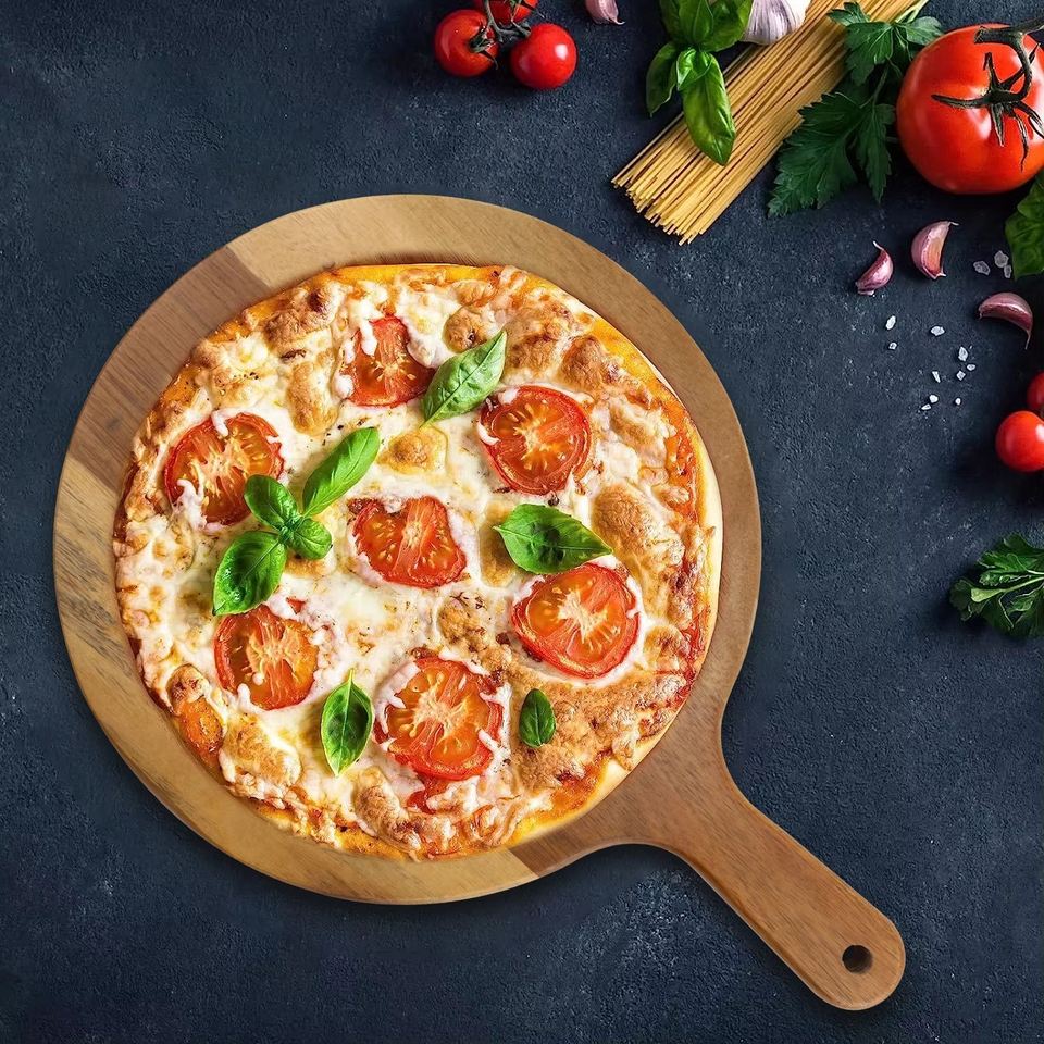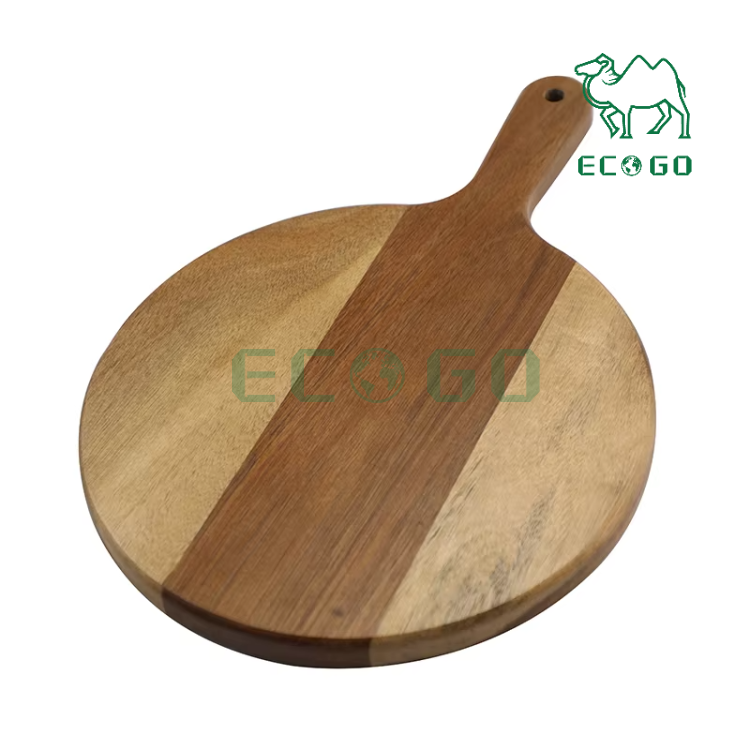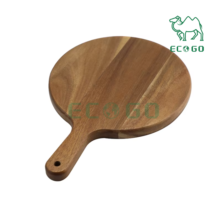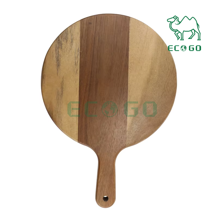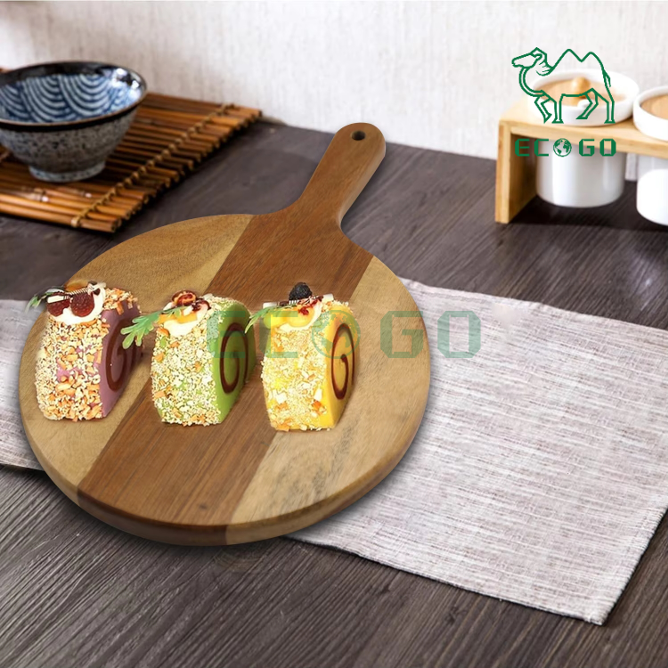 เขียงหั่นพิซซ่าอะคาเซียทรงกลมมีหูจับสำหรับถาดไม้ขนมปังจานอาหารเย็นถาดเค้ก