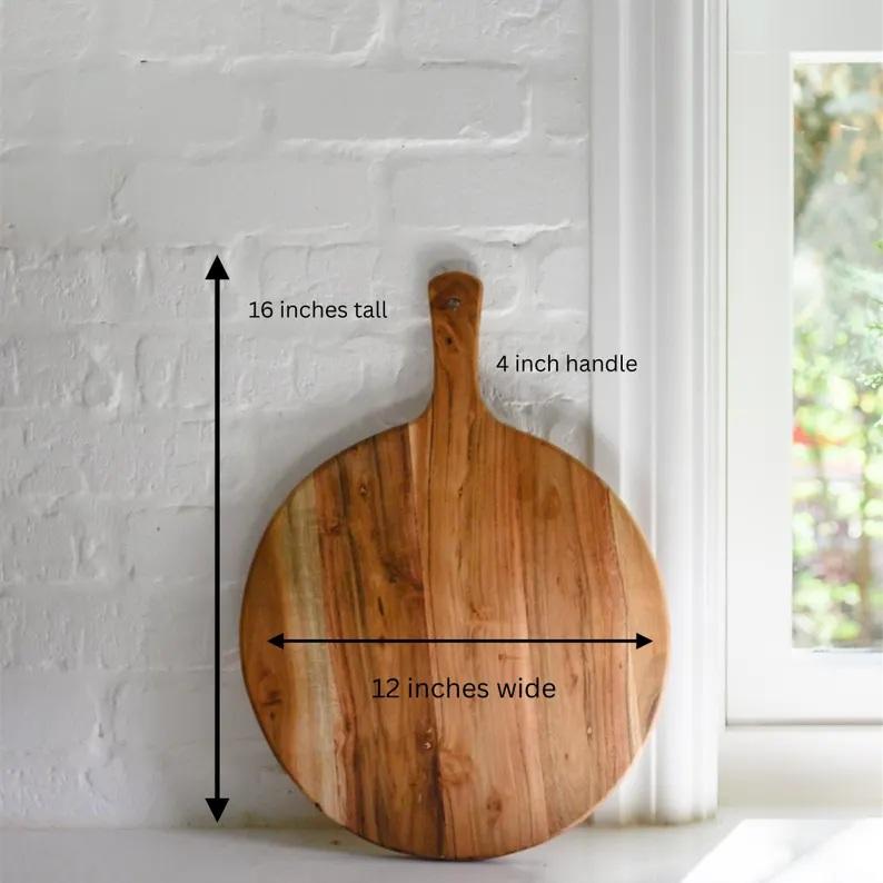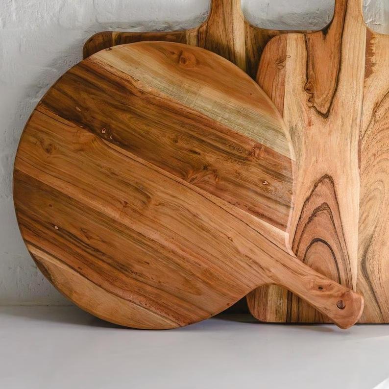 เขียงไม้กระถินทรงกลมขนาดใหญ่ ดีไซน์รูปทรงใบพาย หนา ทนทาน ปลอดภัยสำหรับมีด เหมาะสำหรับการหั่น ตัด เสิร์ฟ และใช้งานในครัวอย่างมีสไตล์