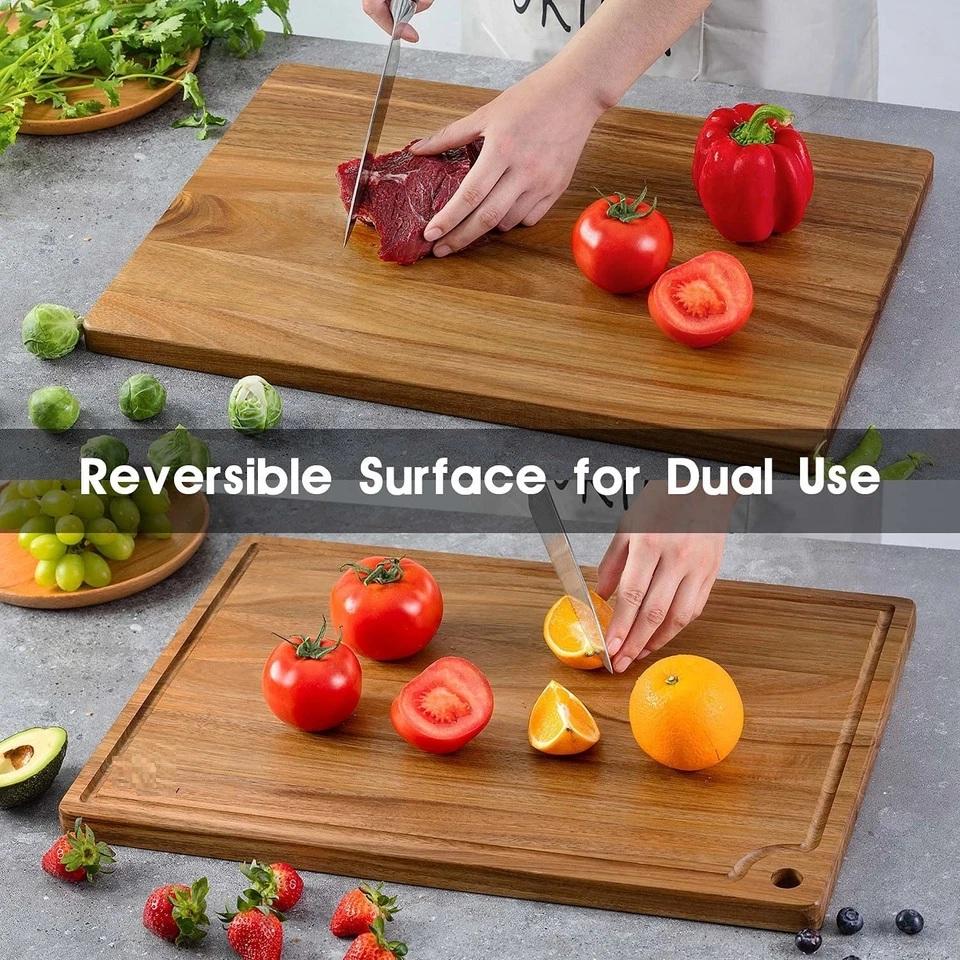 เขียงไม้กระถินณรงค์ หนา ทนทาน ใช้กับมีดได้ดี ผิวเรียบเนียน พร้อมร่องเก็บน้ำผลไม้ และรูแขวน สำหรับใช้ในครัว