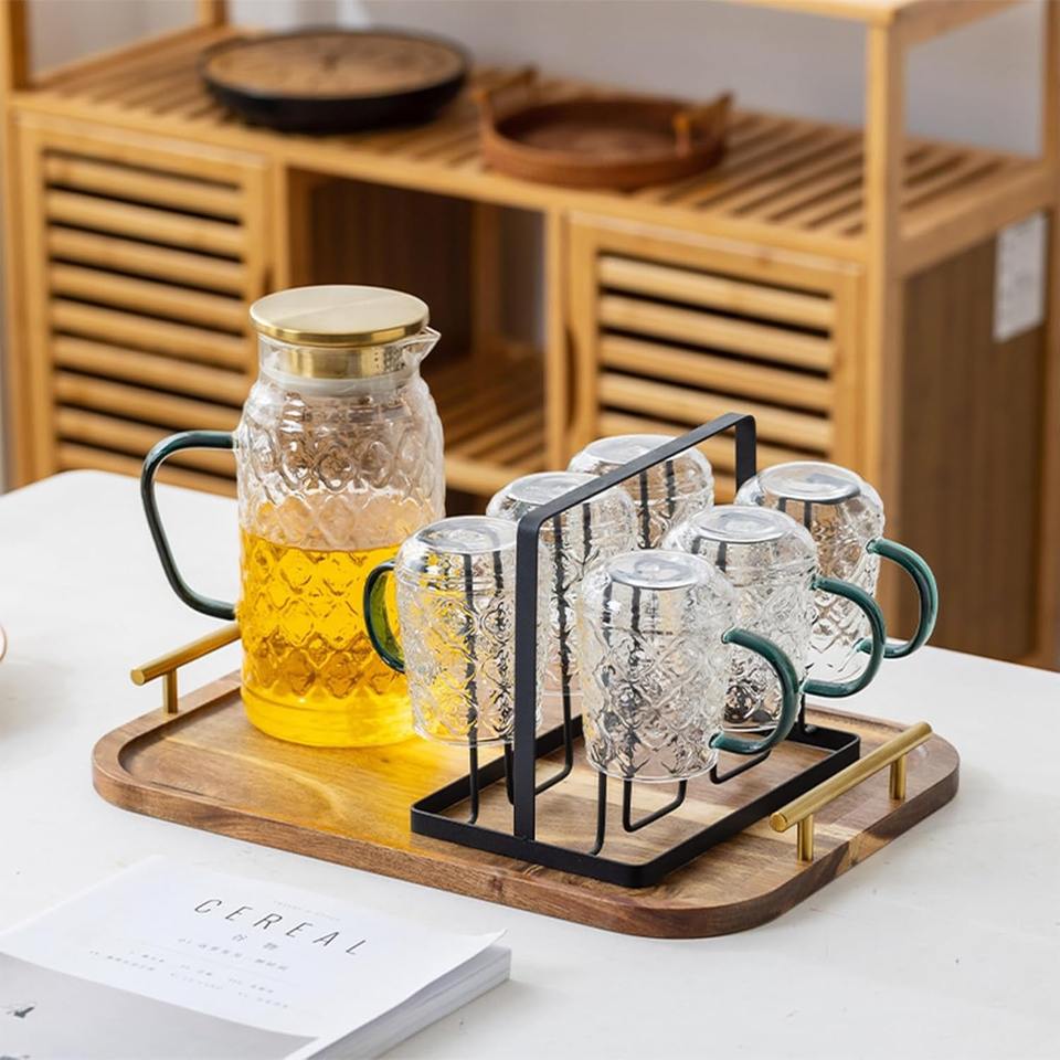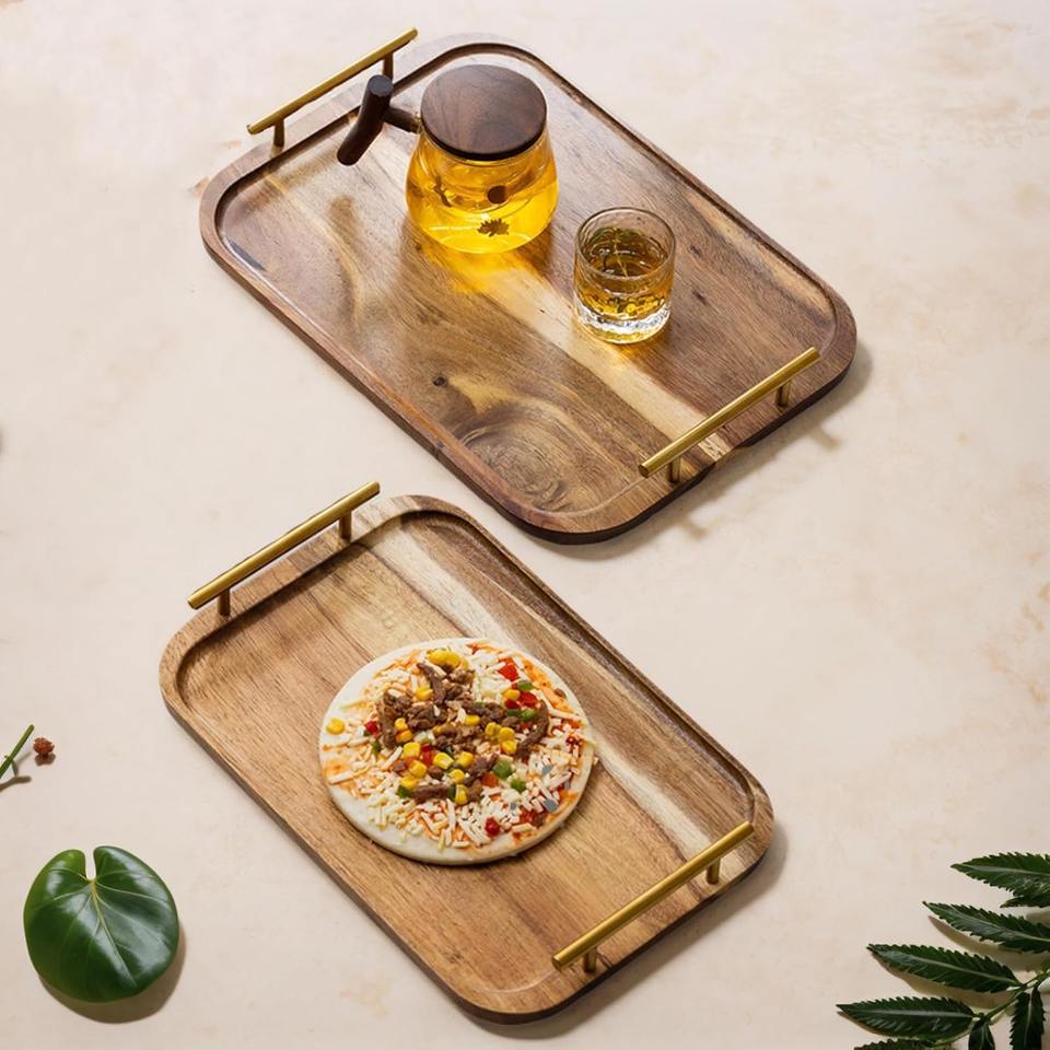 ถาดเสิร์ฟอเนกประสงค์ไม้กระถินเทศเกรดเชิงพาณิชย์ เป็นมิตรกับสิ่งแวดล้อม ดีไซน์เรียบง่ายทรงสี่เหลี่ยมผืนผ้า พร้อมหูจับโลหะ สำหรับใช้ในบ้าน