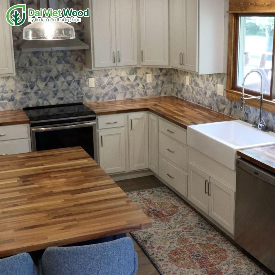 ท็อปเคาน์เตอร์ไม้กระถินณรงค์ ดีไซน์ร่วมสมัย ผ่านการรับรอง FSC เป็นมิตรต่อสิ่งแวดล้อม เคลือบด้วยน้ำมันขี้ผึ้ง สำหรับใช้ในครัว ผลิตในเวียดนาม