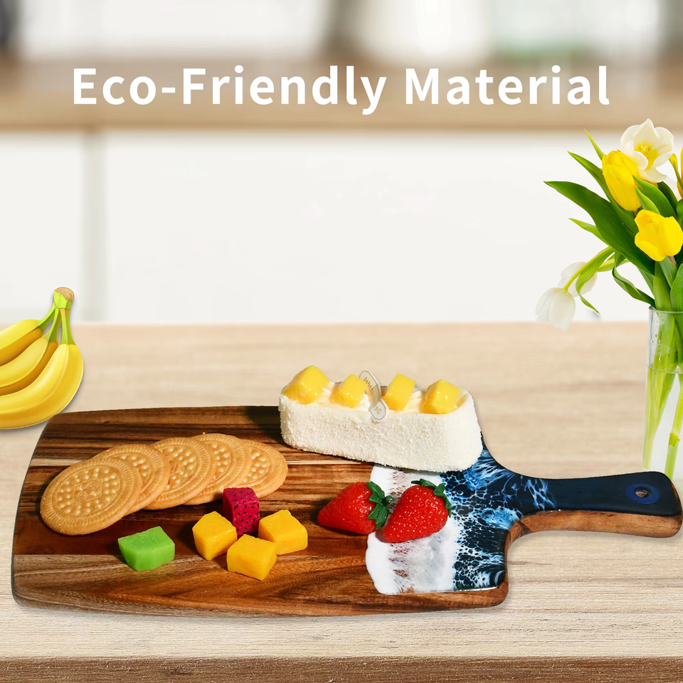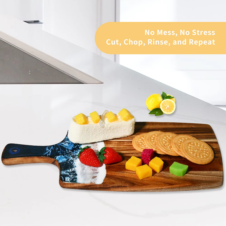 เขียงไม้อะคาเซียแผ่นเรซิ่นรูปคลื่นสีฟ้าชีสและผักชาร์คิวรีจานเสิร์ฟพร้อมที่จับสำหรับงานปาร์ตี้ในครัว