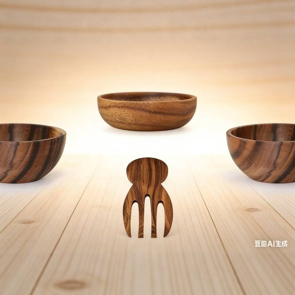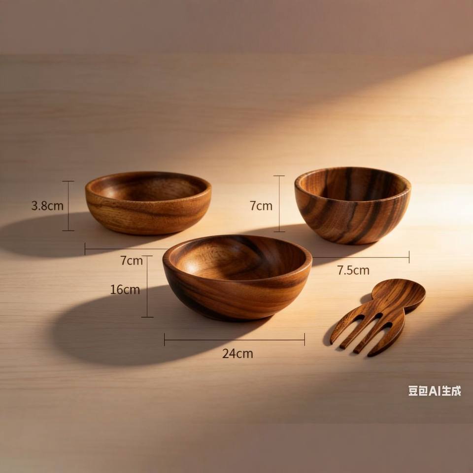 ชุดชามไม้กระถินณรงค์สไตล์ญี่ปุ่น 3 ขนาด พร้อมส้อมไม้ สำหรับเสิร์ฟสลัด ผลไม้ ภาชนะบนโต๊ะอาหาร ดีไซน์เรียบง่าย ทำจากไม้เนื้อแข็ง