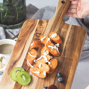 เขียงไม้อะคาเซียทรงสี่เหลี่ยมสำหรับเสิร์ฟและตัดขนมปังด้วยงานฝีมือรูปพระจันทร์เสี้ยวทำจากไม้อะคาเซีย