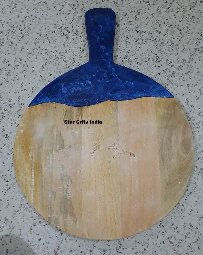 เขียงชีสทรงกลมทำมือจากไม้กระถินและเรซิ่น พร้อมลายแม่น้ำสีฟ้า เป็นมิตรต่อสิ่งแวดล้อม ใช้กับเครื่องล้างจานได้