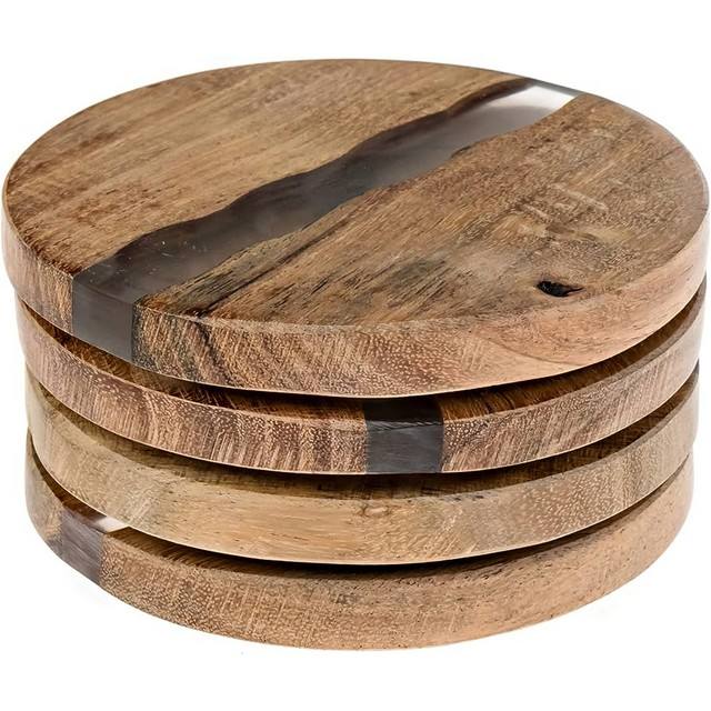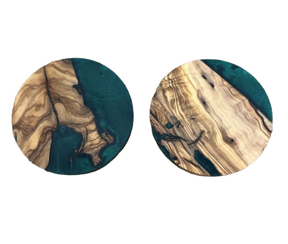 ชุดถาดรองแก้วทรงกลมทำจากไม้อะคาเซียสีเขียวพร้อมถาดรองแก้วขอบเรซินอีพ็อกซี่จากไม้มะกอก