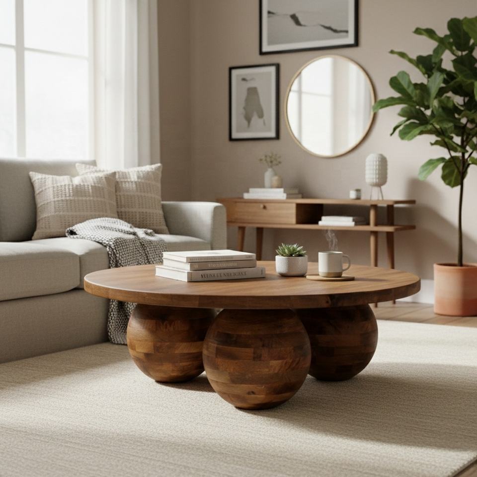 โต๊ะกาแฟไม้ทรงโค้งมนพร้อมขาทรงกลมและท็อปไม้ สำหรับห้องนั่งเล่น โรงแรม บาร์ ร้านอาหาร และวิลล่า