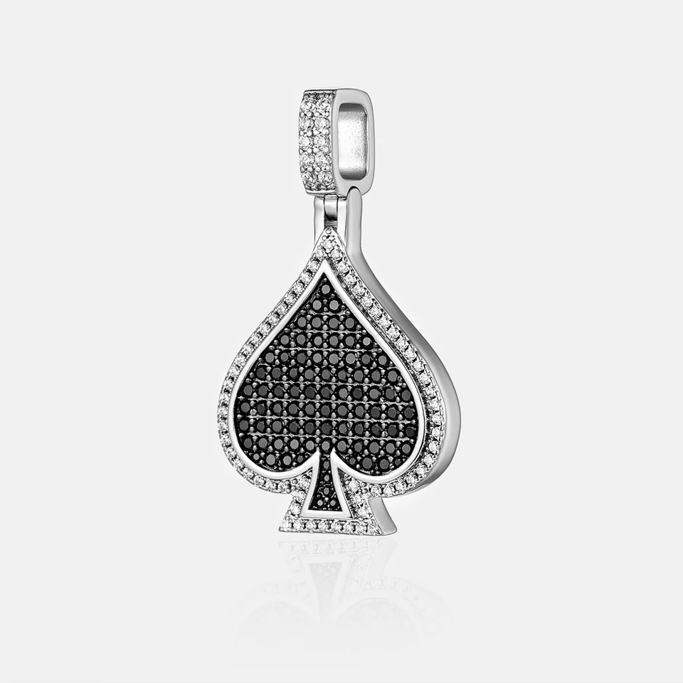 จี้สแตนเลสทรงใบสปาดสีเงินทิเบต ประดับเพชรสีดำ ดีไซน์ใบสปาดสีเงิน ขอบประดับเพชรแบบ Iced สไตล์ฮิปฮอป ประดับลูกปัดแบบ Micro Pave