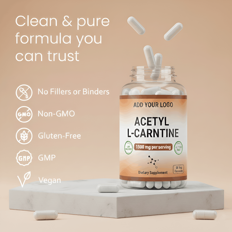 อะเซทิล แอล-คาร์นิทีน แคปซูล 1500 มก. ต่อหนึ่งหน่วยบริโภค ผลิตภัณฑ์เสริมอาหาร แคปซูลวีแกน รับผลิตแบรนด์ส่วนตัวและจำหน่ายแบบขายส่ง