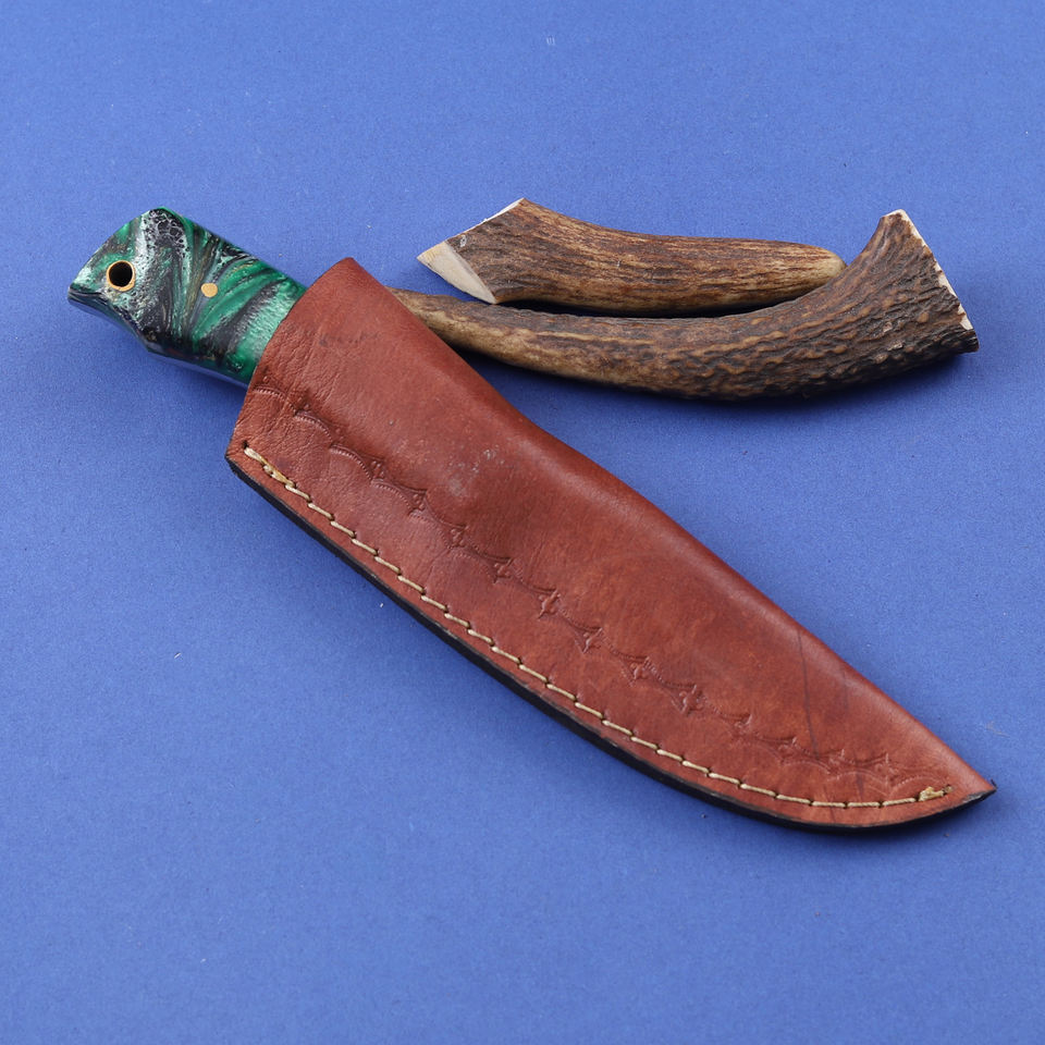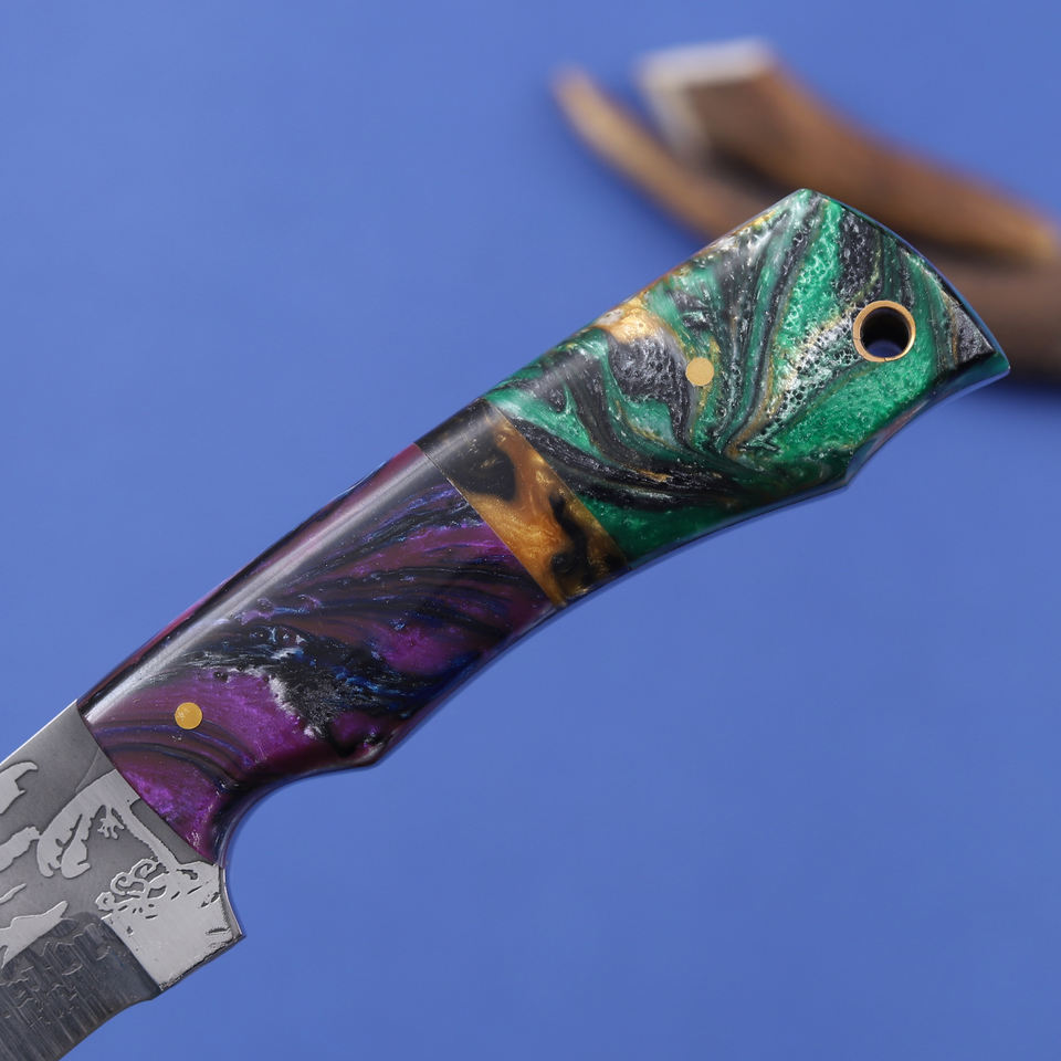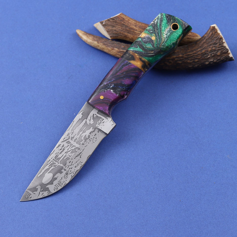 มีดสกินเนอร์ใบมีดเหล็ก 12c27 ชุบกรด ปลายแหลม ด้ามเรซิ่นเกรดอุตสาหกรรม ผลิตตามสั่ง (OEM) สำหรับการล่าสัตว์