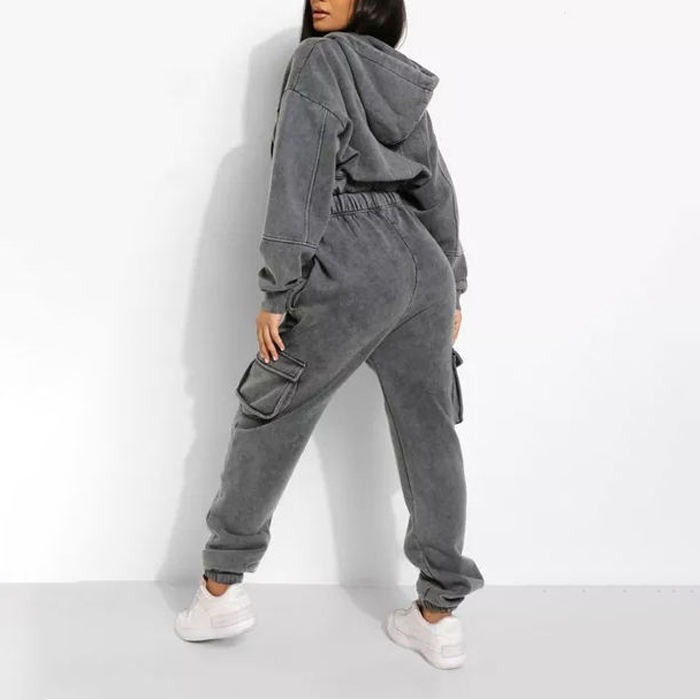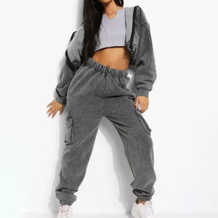 ชุดเซ็ต 2 ชิ้น ลาย Acid Wash สำหรับผู้หญิง เสื้อครอปแขนยาวแบบซิป และกางเกงเลกกิ้งเอวสูงเข้าชุด ชุดออกกำลังกายสำหรับฤดูใบไม้ร่วง OEM 2026