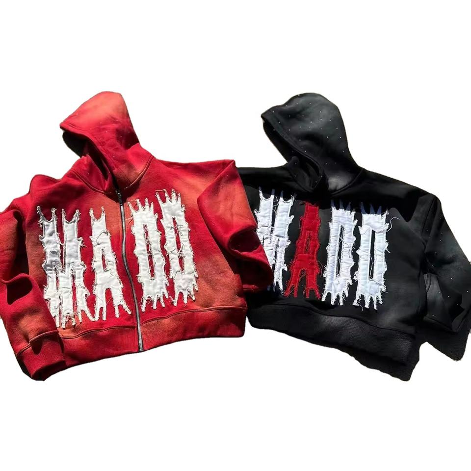 เสื้อฮู้ดดี้ทรงบ็อกซี่แบบครอป ซิปหน้า แต่งลายปัก แอพพลิเค แอซิดวอช ประดับคริสตัล สำหรับผู้ชายและผู้หญิง สไตล์ซันเฟด แพทช์เวิร์ค