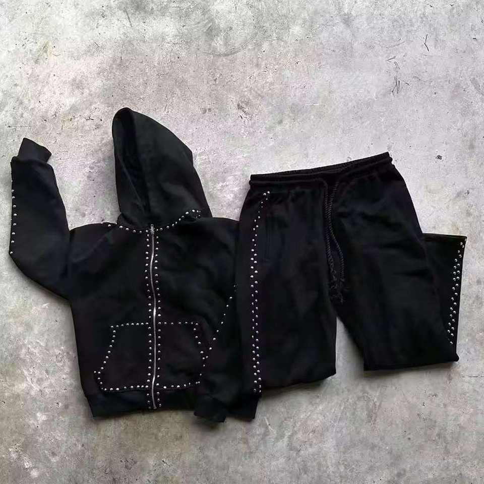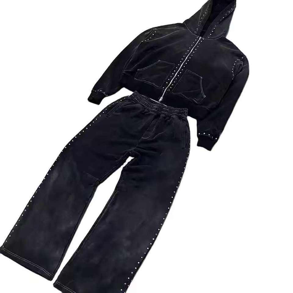 ชุดเซ็ตเสื้อฮู้ดดี้และกางเกงจ็อกเกอร์ผู้ชายลายพิมพ์คริสตัลแบบฟอกสีสไตล์วินเทจ ชุดลำลองสองชิ้นแบบฟอกสีสไตล์ดิสเทรส