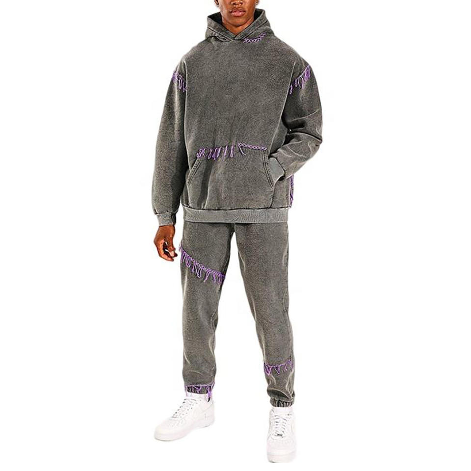 Acid Wash Sweat Suit Jogger Tracksuit Short Sleeve Cropped Boxy Custom Patch 2 Piece T Shirt and Pants Set Men