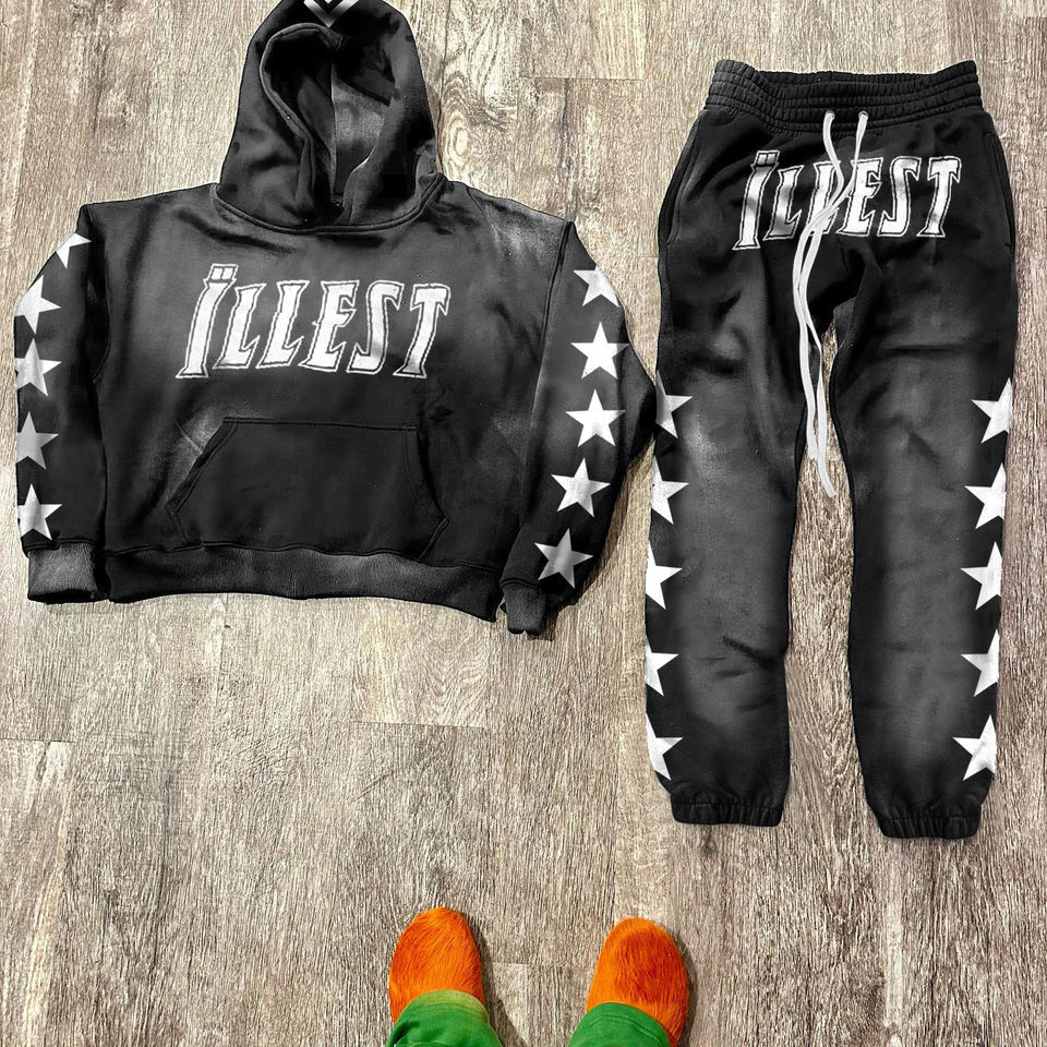 ชุดเซ็ตเสื้อฮู้ดดี้พิมพ์ลายแบบสั่งทำพิเศษสำหรับผู้หญิงไซส์พลัส ผ้าฝ้ายระบายอากาศเป็นมิตรกับสิ่งแวดล้อม พร้อมกางเกงวอร์มปักลายขาดๆ แบบย้อมสีเอซิด