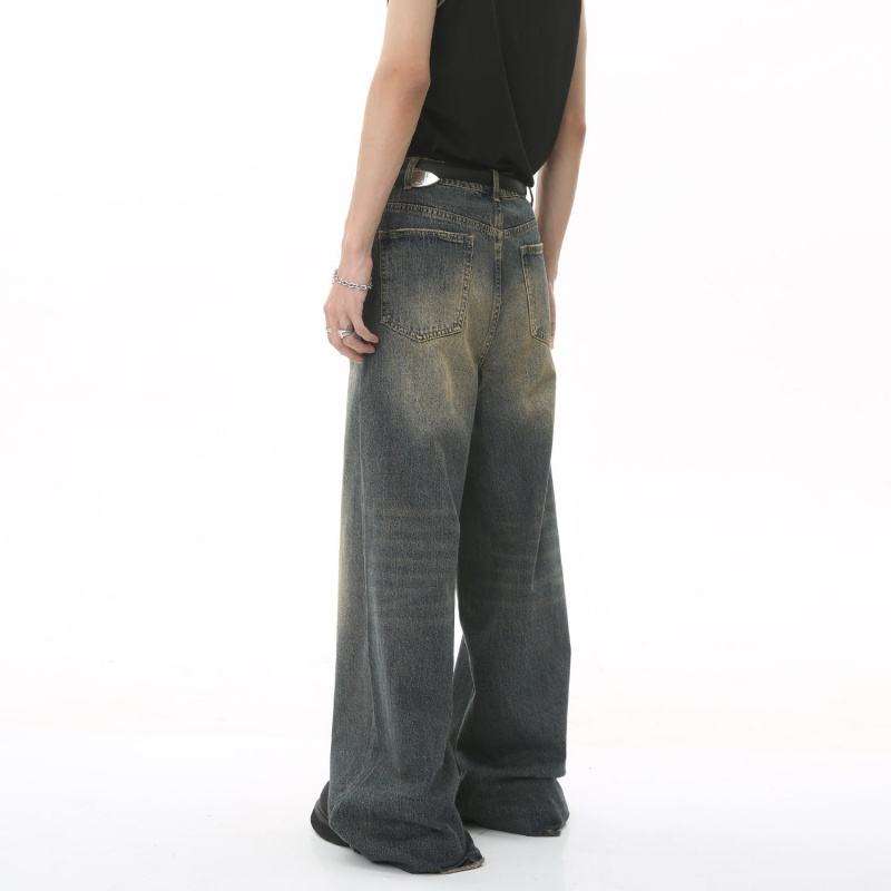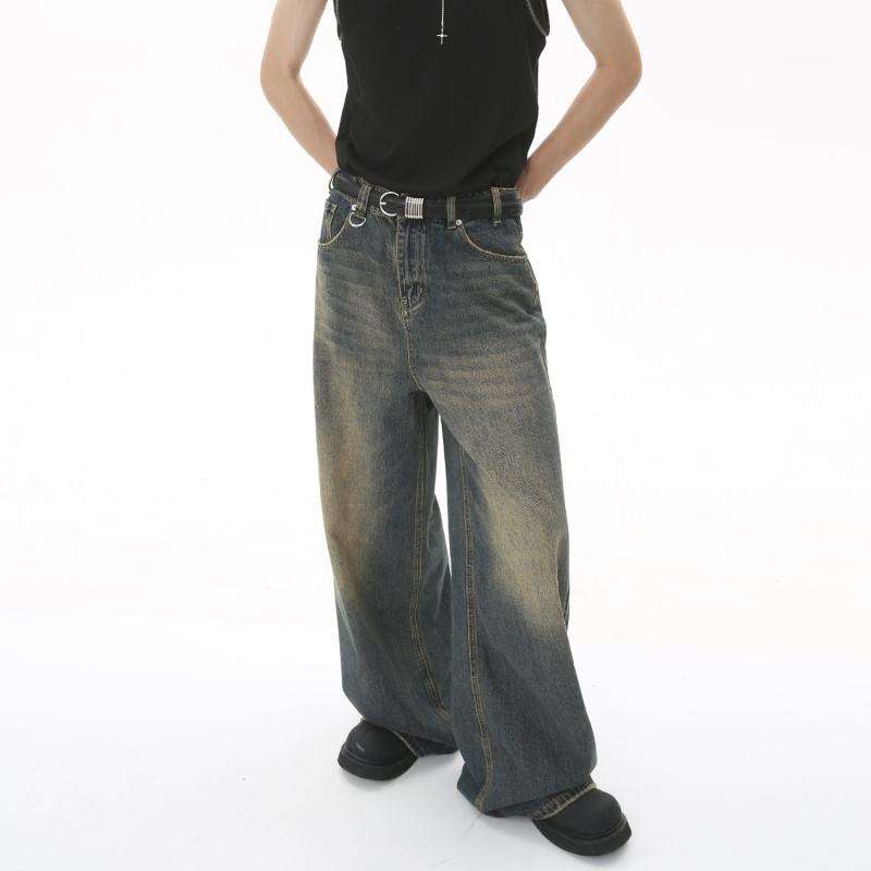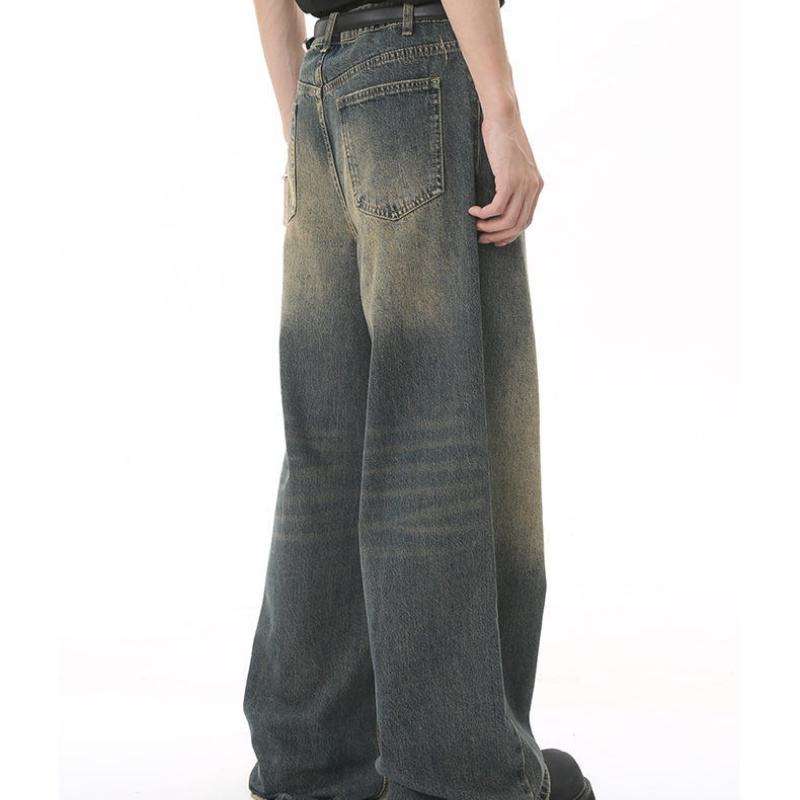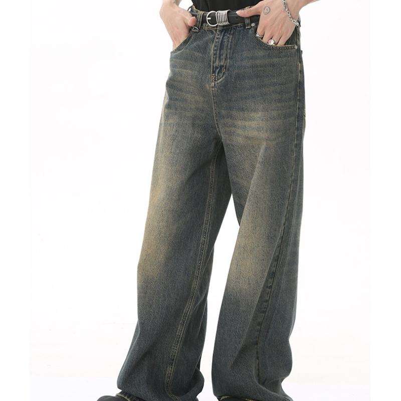 กางเกงยีนส์ผู้ชายทรงหลวมแบบดับเบิ้ลนี ลุคสตรีทแวร์ ทรงหลวม ขากว้าง ย้อมสีแบบแอซิดวอช รักษ์โลก เหมาะสำหรับฤดูหนาว