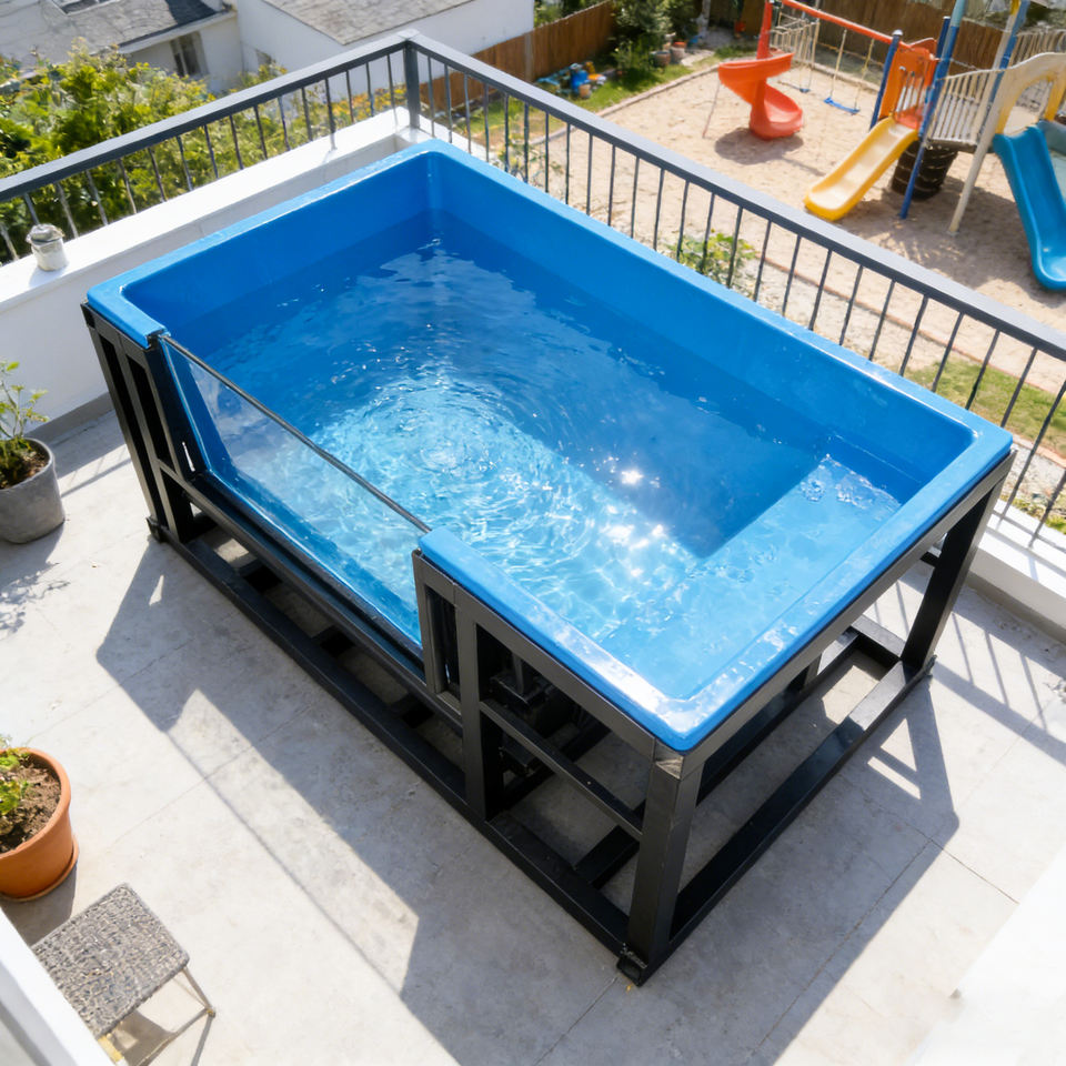 สระว่ายน้ำอะคริลิกเหนือพื้นดินพร้อมหน้าต่างใสสำหรับระเบียง อ่างน้ำร้อนและน้ำเย็น