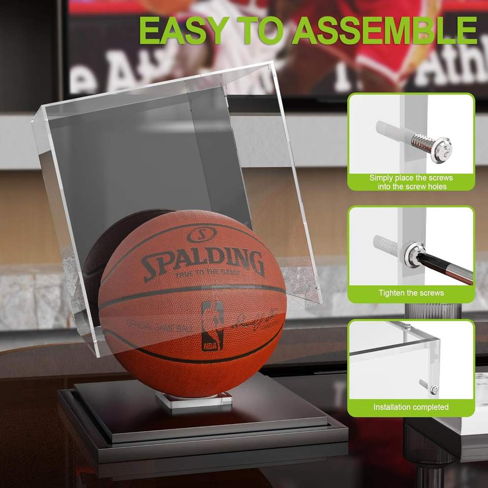 Acrylic Basketball Display Case with Mirror and Black Metal Base, Transparent Removable Stand for Autographed Ball