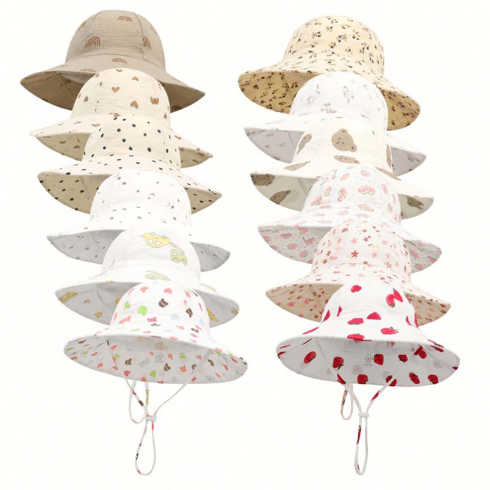 หมวกบักเก็ตเด็กปรับได้ ผ้าฝ้าย ระบายอากาศดี ป้องกันแสงแดด ลายการ์ตูนผลไม้ดอกไม้