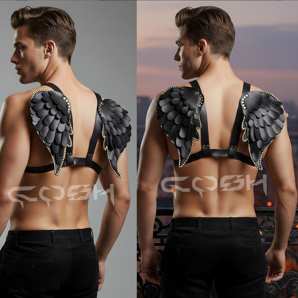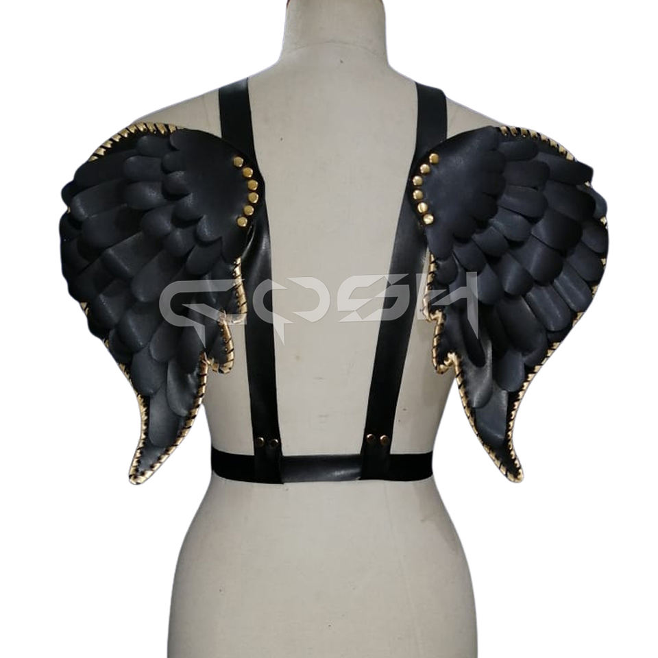 สายรัดอกปรับได้ หนังเทียมสีดำ ประดับปีกนางฟ้า พร้อมหมุดทอง