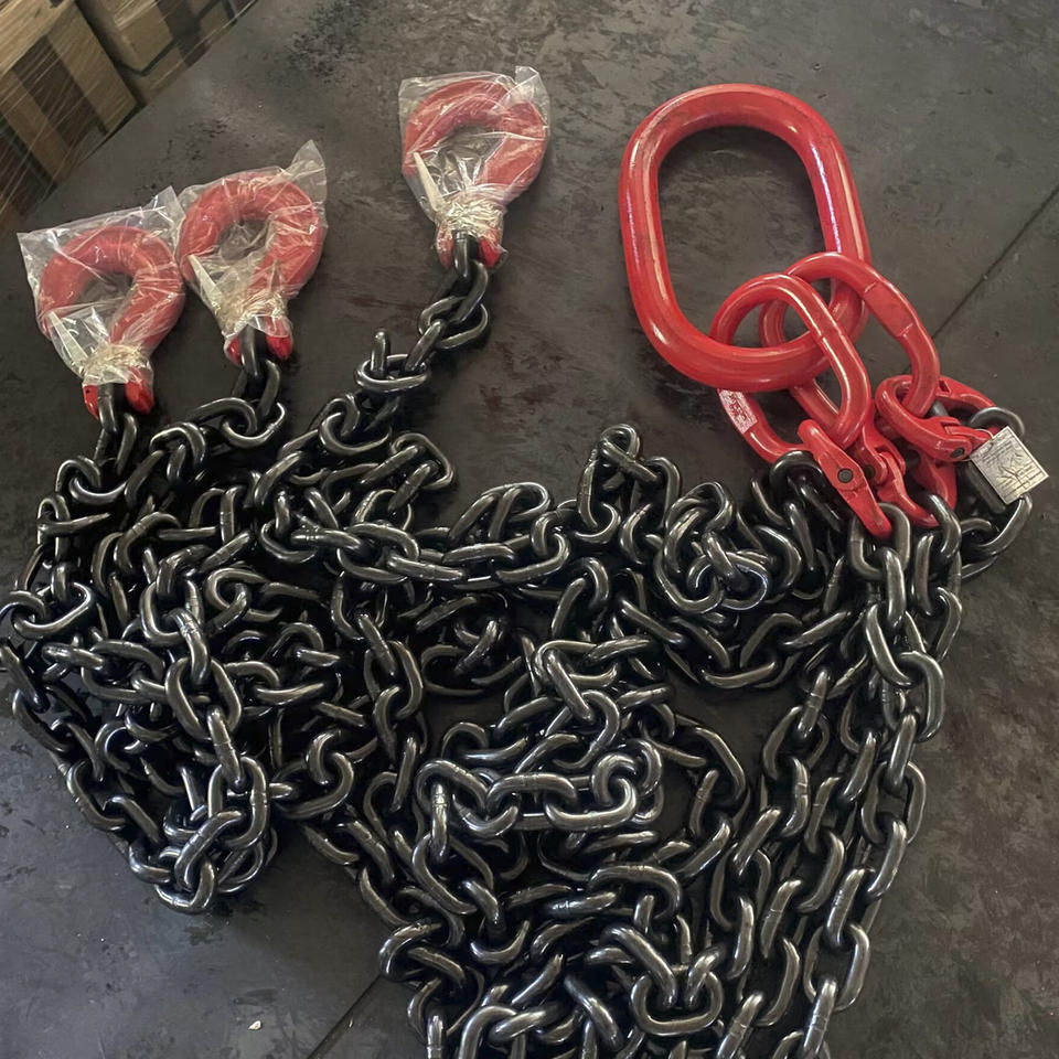 สลิงโซ่เหล็กดำ G80 20Mn2 สำหรับเครนปรับระดับได้ ขนาด 1/4-1/2 นิ้ว แบบสี่ขา สองขา และแบบปลายเดียว