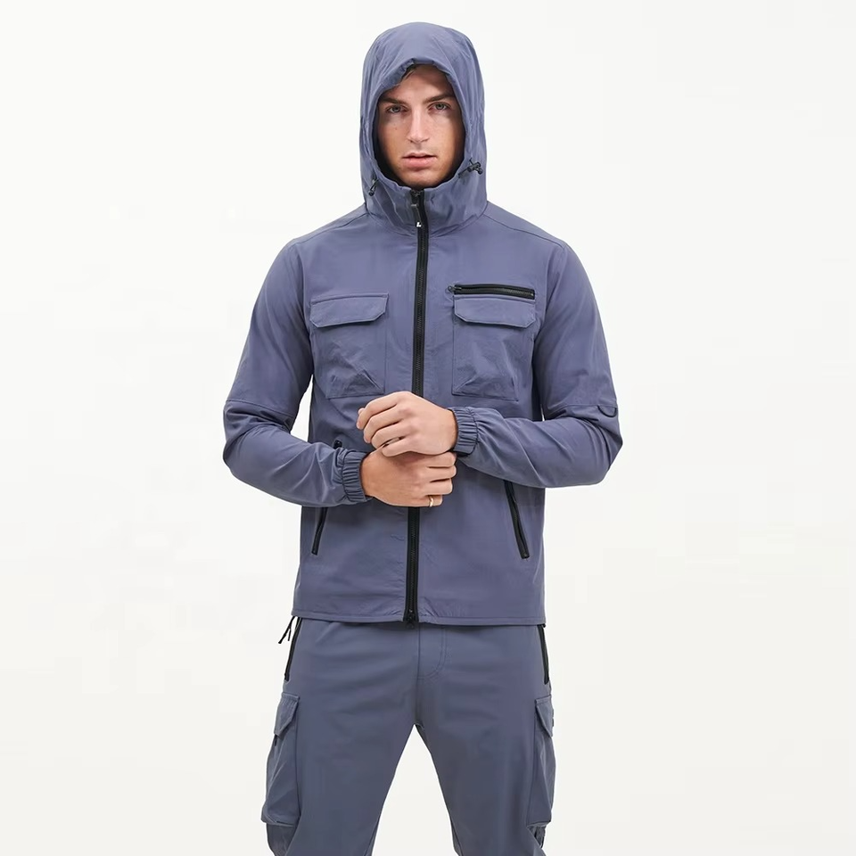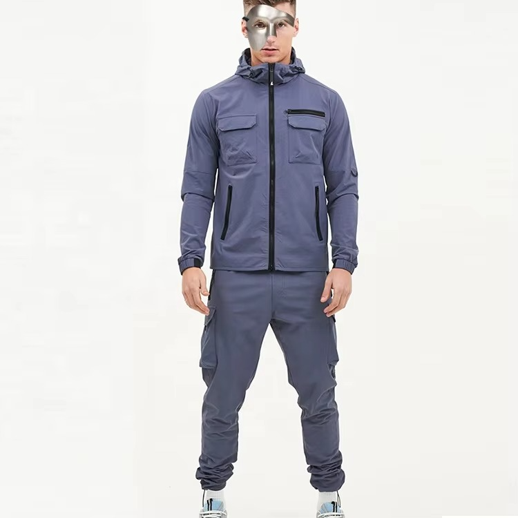 ชุดวอร์มไนลอนสำหรับผู้ชายชุดออกกำลังกายแบบรูดซิปสีตัดกันชุดออกกำลังกายแบบปรับได้