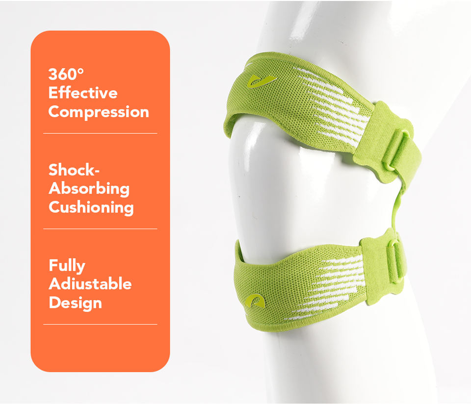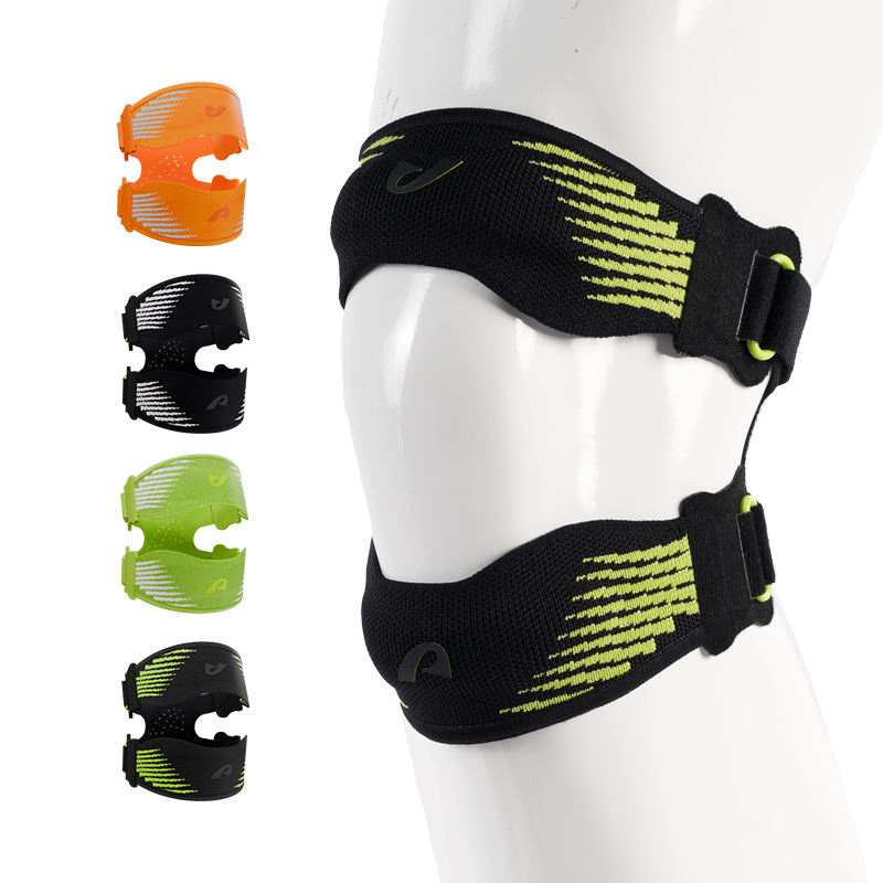 สายรัดเข่าแบบปรับได้สองชั้น รองรับกระดูกสะบ้า ระบายอากาศได้ดี ผลิตจากโพลีเอสเตอร์ ปิดด้วยแถบตีนตุ๊กแก เหมาะสำหรับวิ่ง/บาสเกตบอล บรรเทาอาการปวด พร้อมสปริง