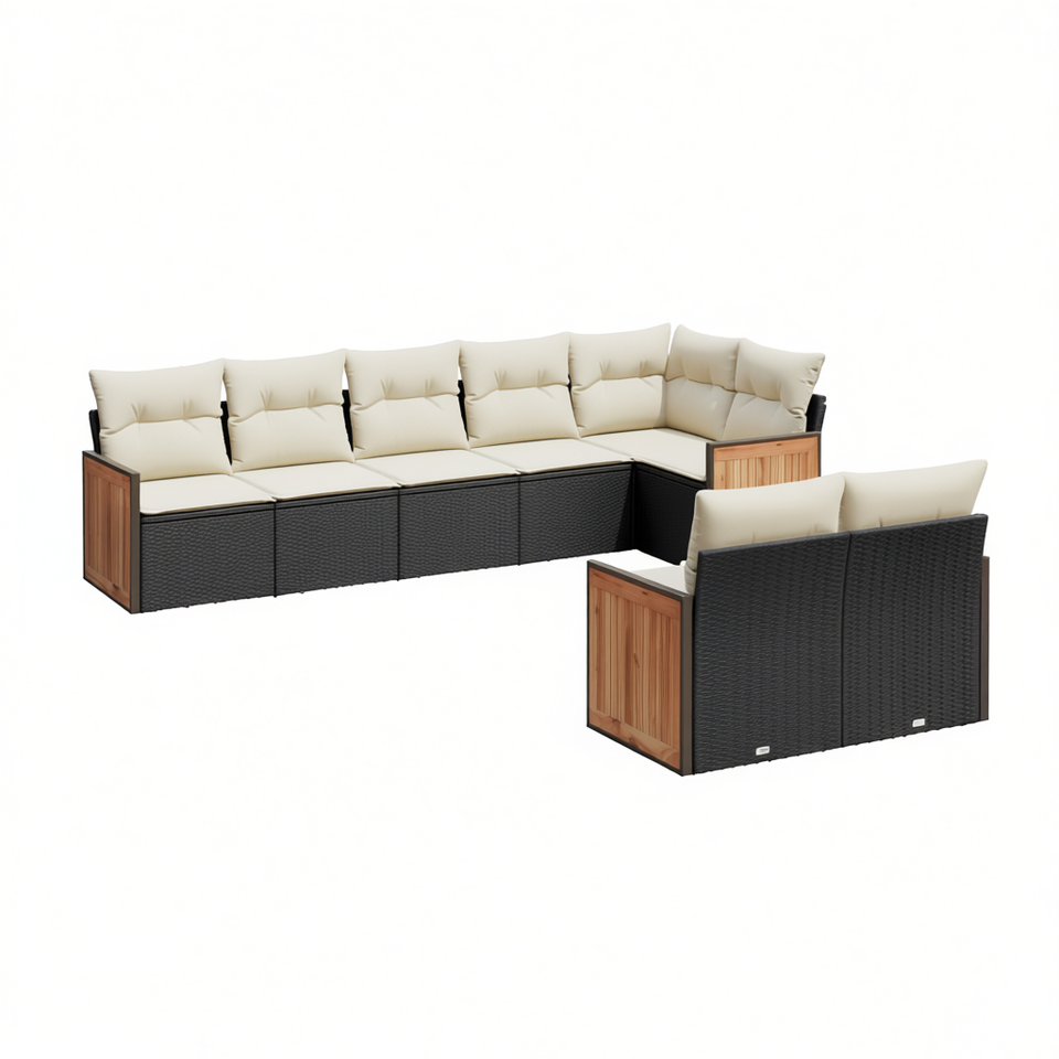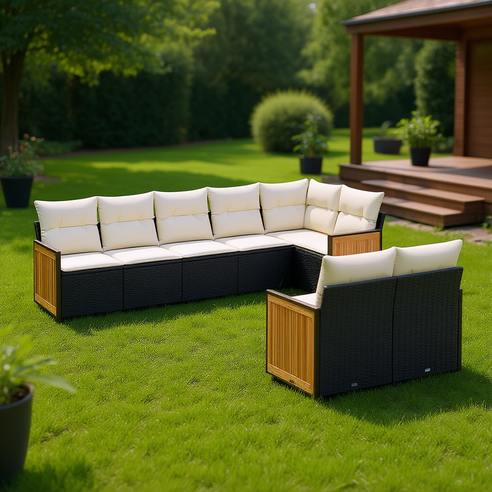 ชุดโซฟาสวนทันสมัย สีดำครีม วัสดุหวาย PE 6 ที่นั่ง เฟอร์นิเจอร์กลางแจ้ง โครงไม้สัก ขาปรับระดับได้ ดีไซน์สวยงาม